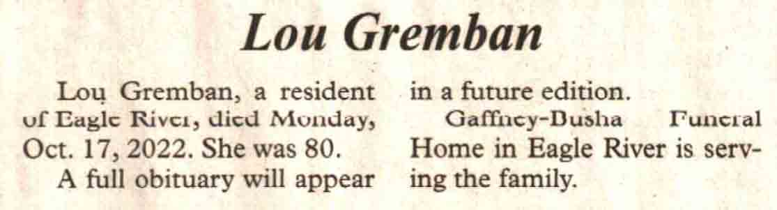 | Gremban | Lucille M 'Lou' (Dillinger) #2 | 02 Dec 1941 | 17 Oct 2022 | VCNR | 26 Oct 2022 | 4A |