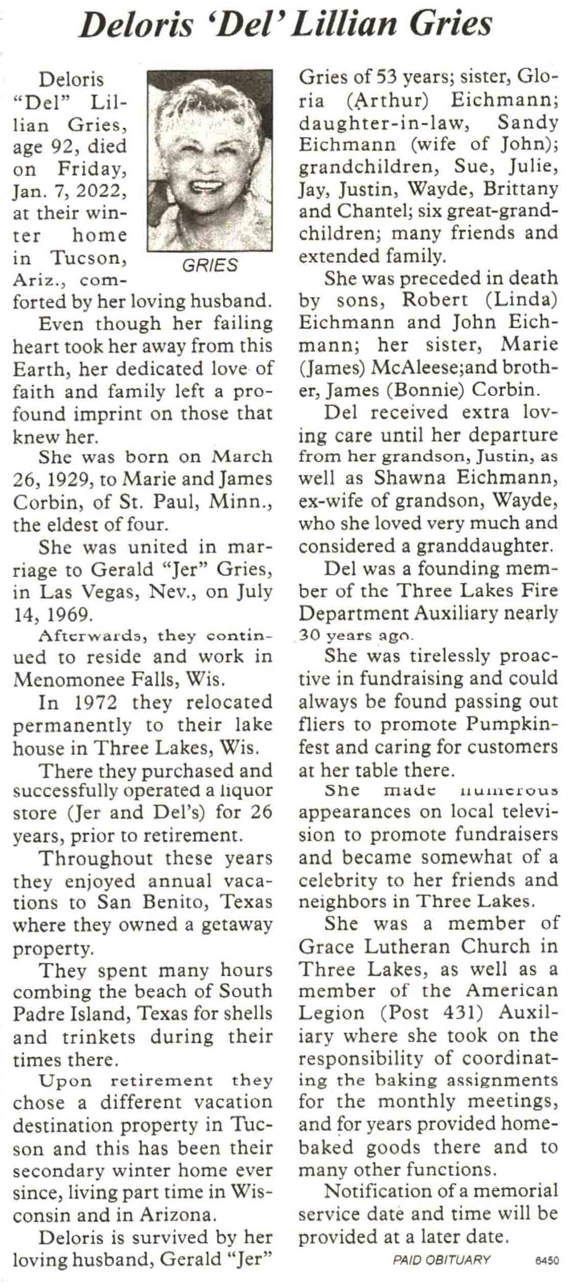 | Gries | Deloris Lillian 'Del' (Corbin) | 26 Mar 1929 | 07 Jan 2022 | VCNR | 02 Feb 2022 | 4A |