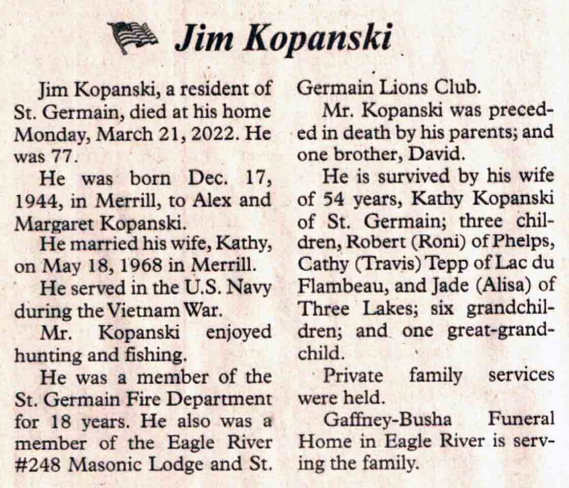 | Staszak | Vincent Stanley, Jr | c 1945 | 07 Feb 2022 | VCNR | 09 Mar 2022 | 4A |