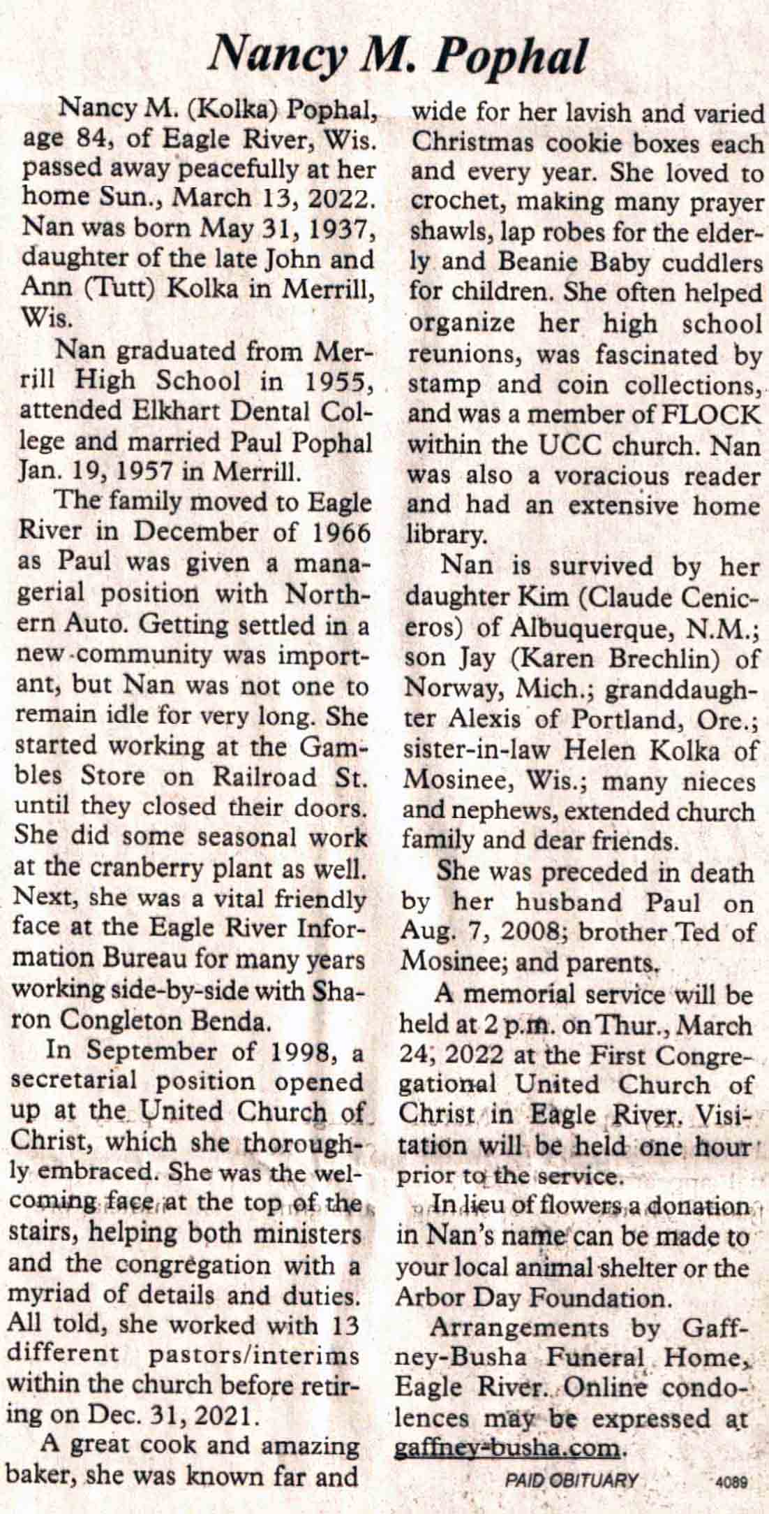 | Pophal | Nancy M (Kolka) #2 | 31 May 1937 | 13 Mar 2022 | VCNR | 23 Mar 2022 | 4A |