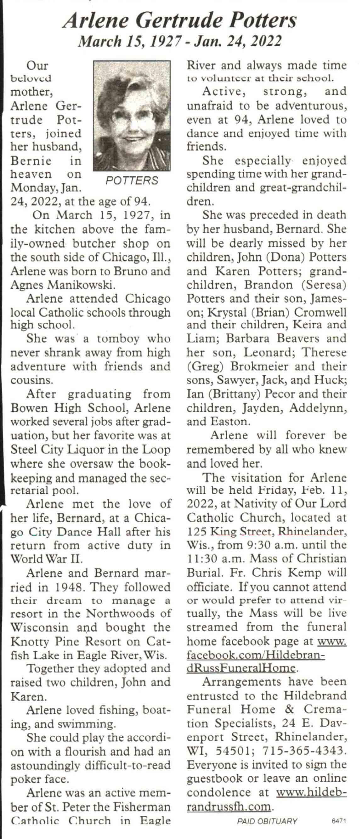 | Potters | Arlene Gertrude (Manikowski) | 15 Mar 1927 | 24 Jan 2022 | VCNR | 09 Feb 2022 | 4A |