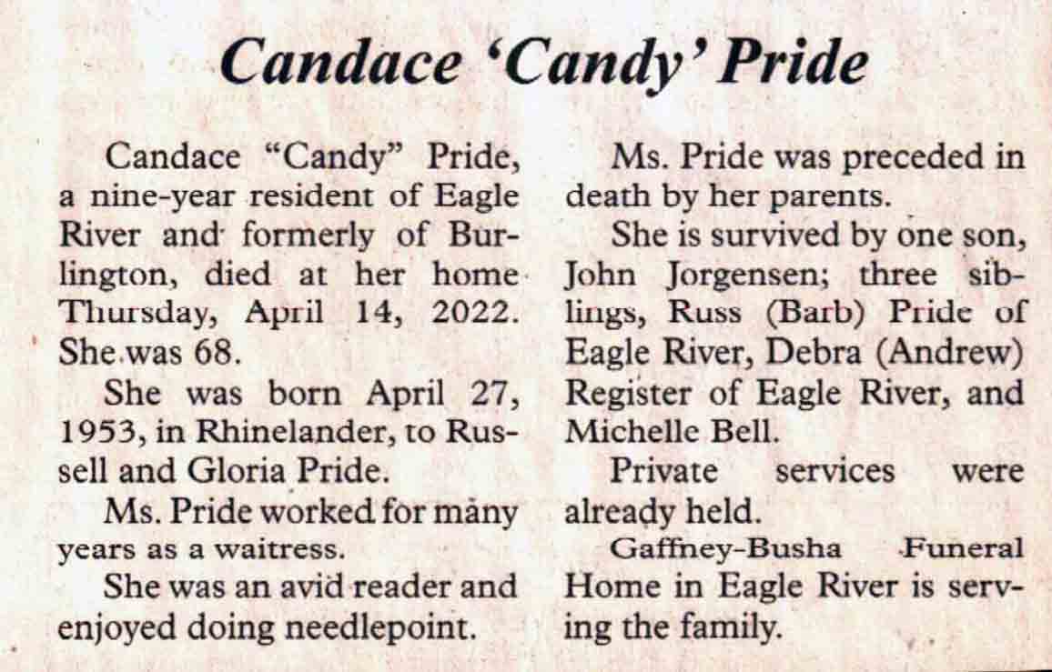 | Pride | Candace 'Candy' | 27 Apr 1953 | 14 Apr 2022 | VCNR | 20 Apr 2022 | 4A |