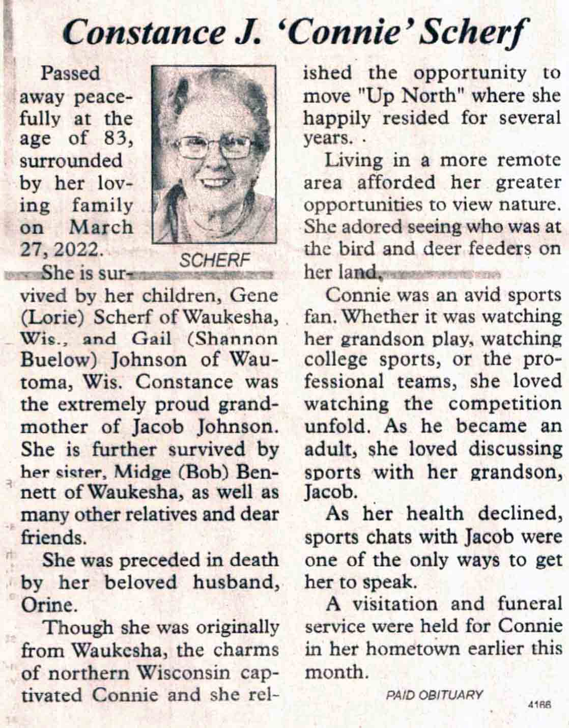 | Scherf | Constance J 'Connie' | c 1939 | 27 Mar 2022 | VCNR | 13 Apr 2022 | 4A |