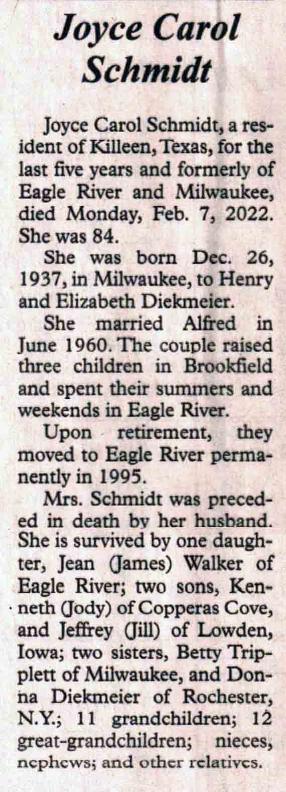 | Schmidt | Joyce Carol (Diekmeier) | 26 Dec 1937 | 07 Feb 2022 | VCNR | 23 Feb 2022 | 5A |
