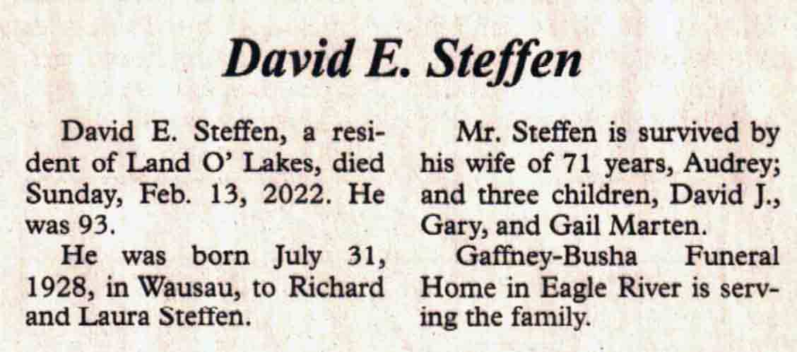 | Steffen | David E | 31 Jul 1928 | 13 Feb 2022 | VCNR | 23 Feb 2022 | 5A |