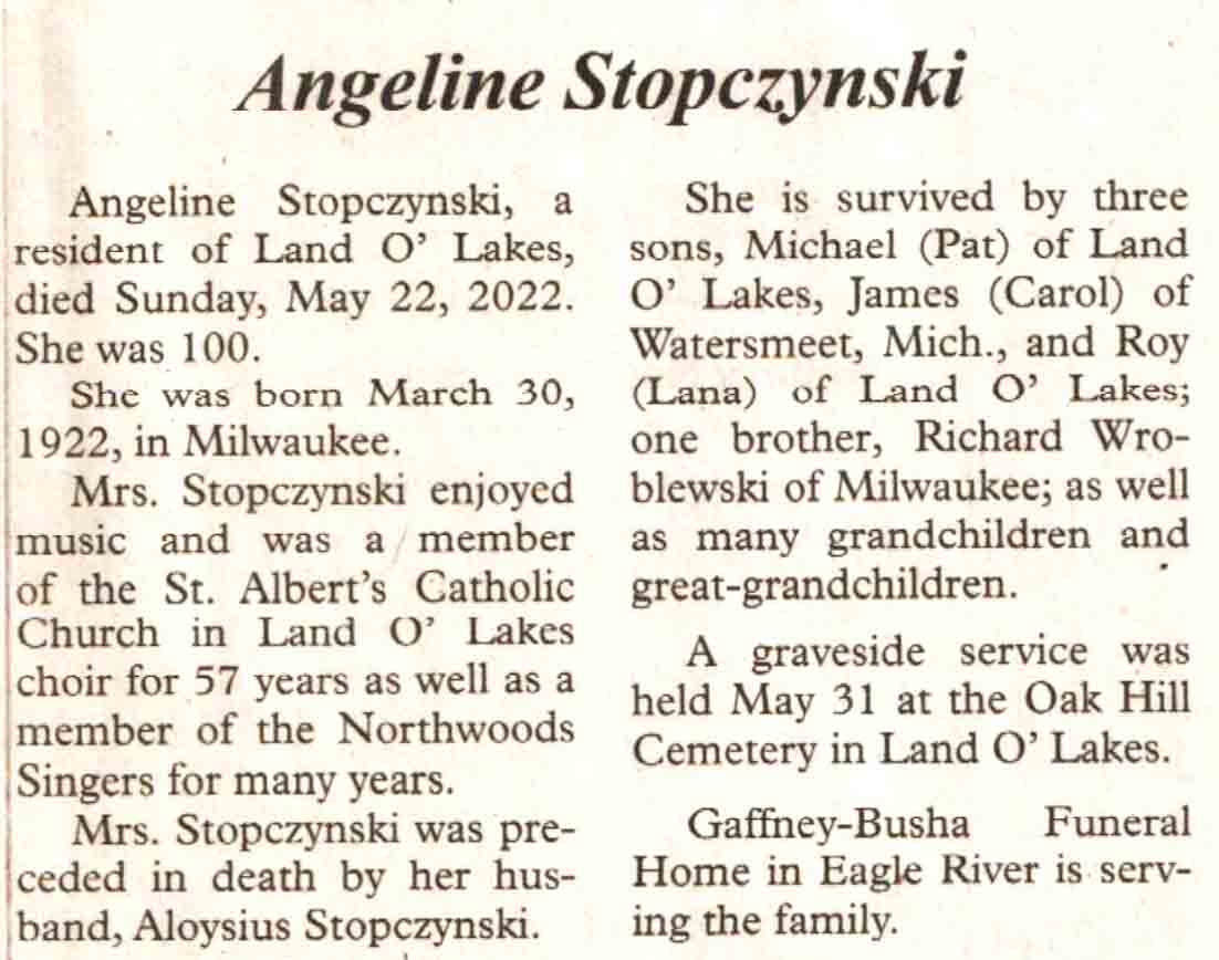 | Stopczynski | Angeline | 30 Mar 1922 | 22 May 2022 | VCNR | 08 Jun 2022 | 4A |