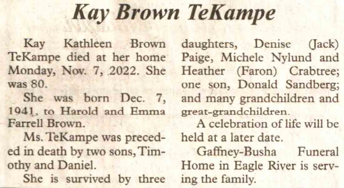 | TeKampe | Kay (Brown) | 07 Dec 1941 | 07 Nov 2022 | VCNR | 16 Nov 2022 | 4A |