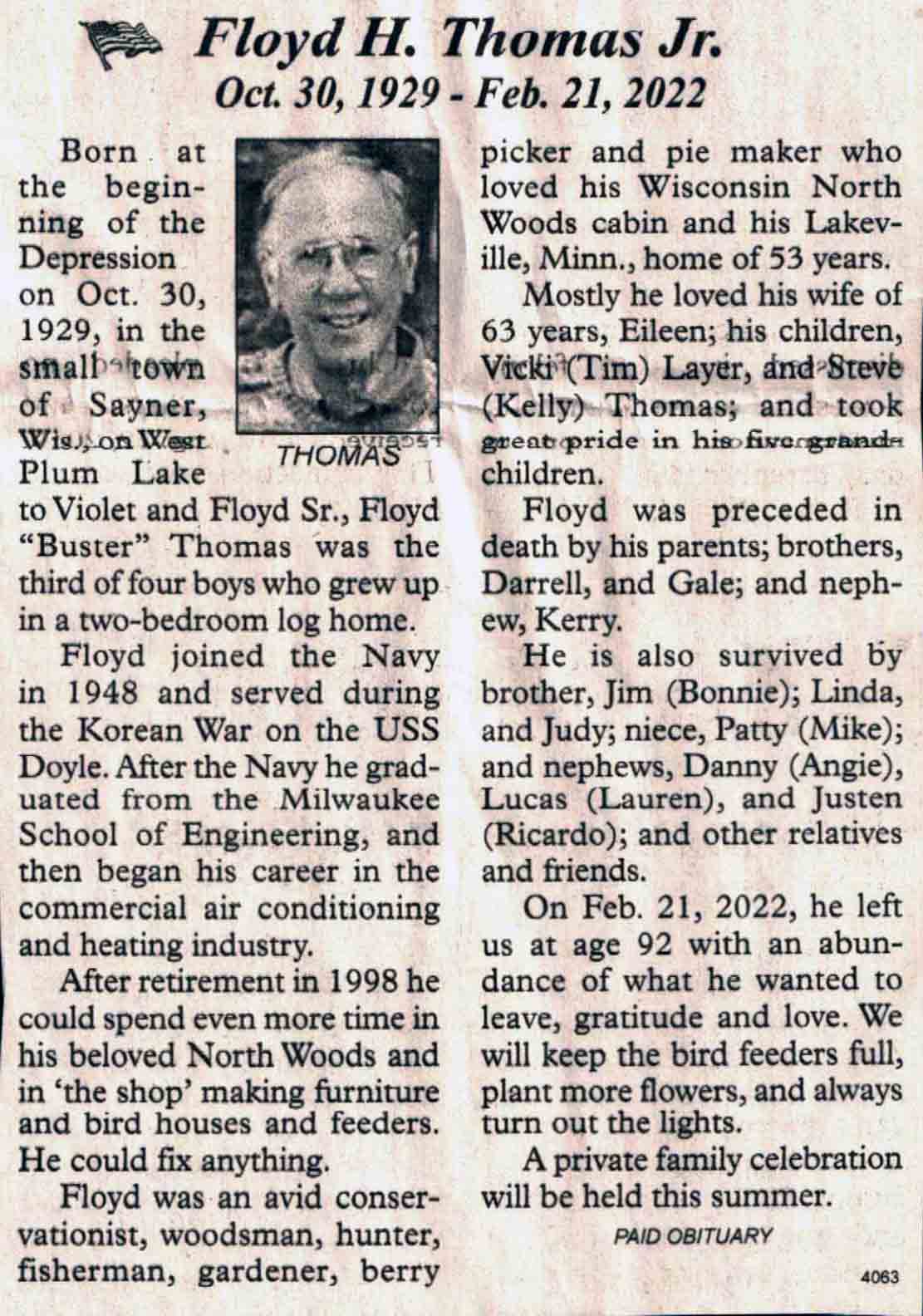 | Thomas | Floyd H, Jr | 30 Oct 1929 | 21 Feb 2022 | VCNR | 09 Mar 2022 | 4A |