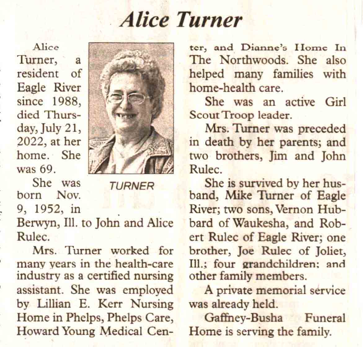 | Turner | Alice (Rulec) | 09 Nov 1952 | 21 Jul 2022 | VCNR | 27 Jul 2022 | 4A |