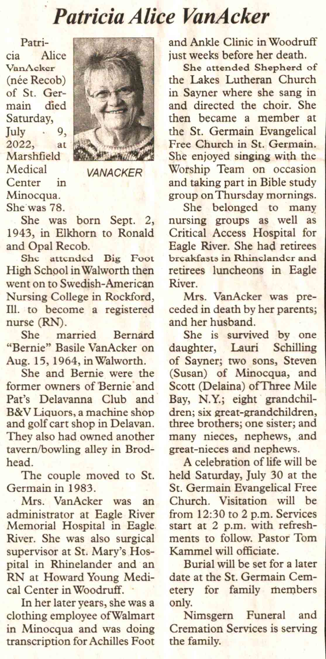 | VanAcker | Patricia Alice (Recob) | 02 Jul 1943 | 09 Jul 2022 | VCNR | 27 Jul 2022 | 4A |