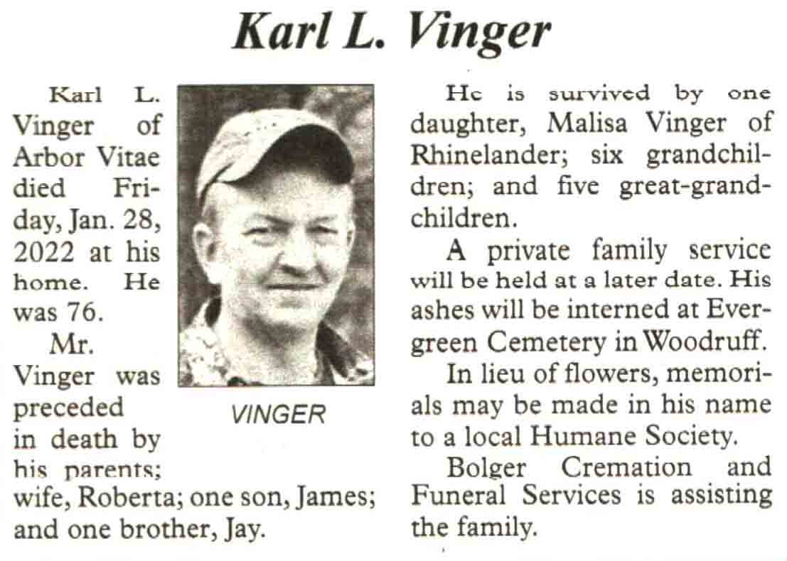 | Vinger | Karl L | c 1946 | 28 Jan 2022 | VCNR | 02 Feb 2022 | 4A |