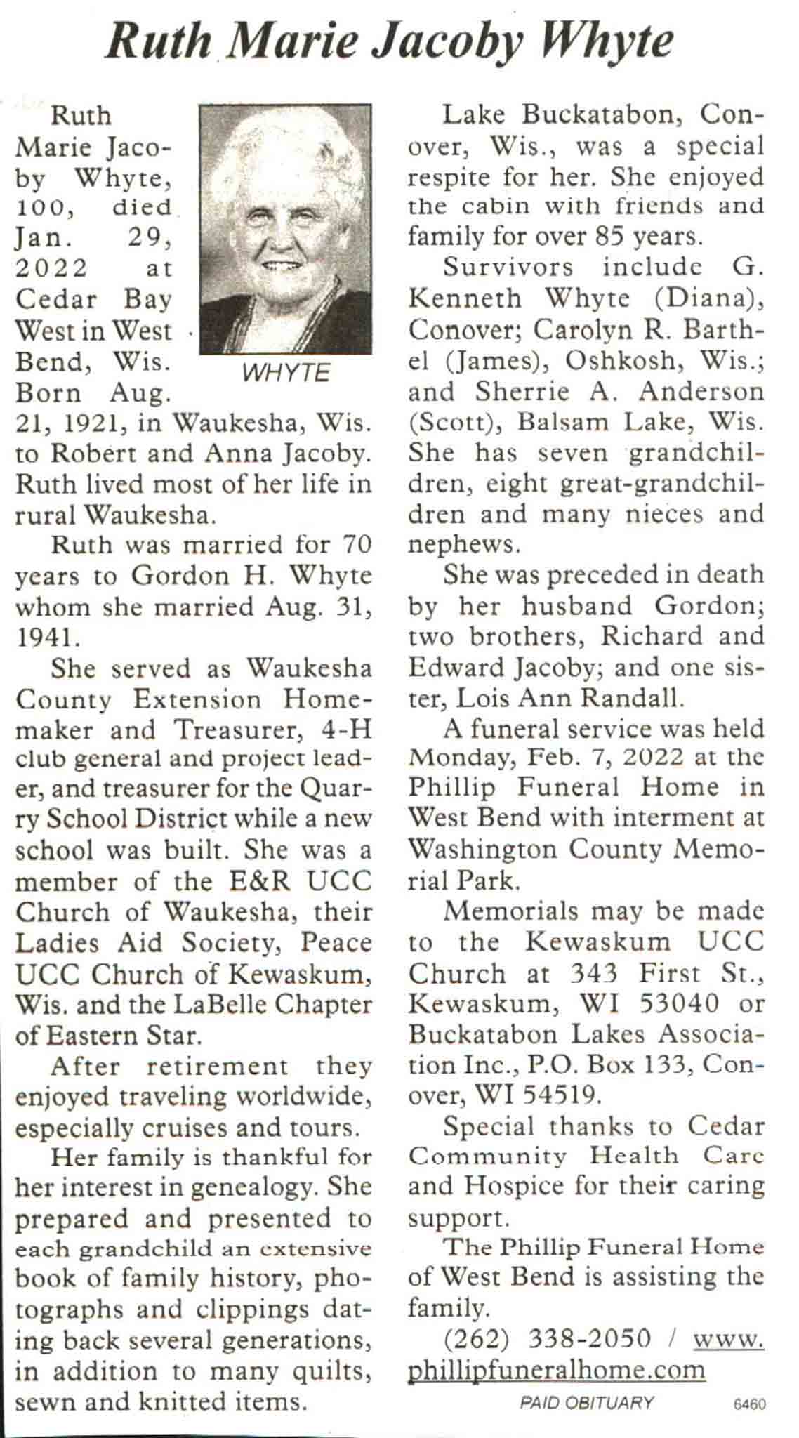 | Whyte | Ruth Marie (Jacoby) | 21 Aug 1921 | 29 Jan 2022 | VCNR | 09 Feb 2022 | 4A |