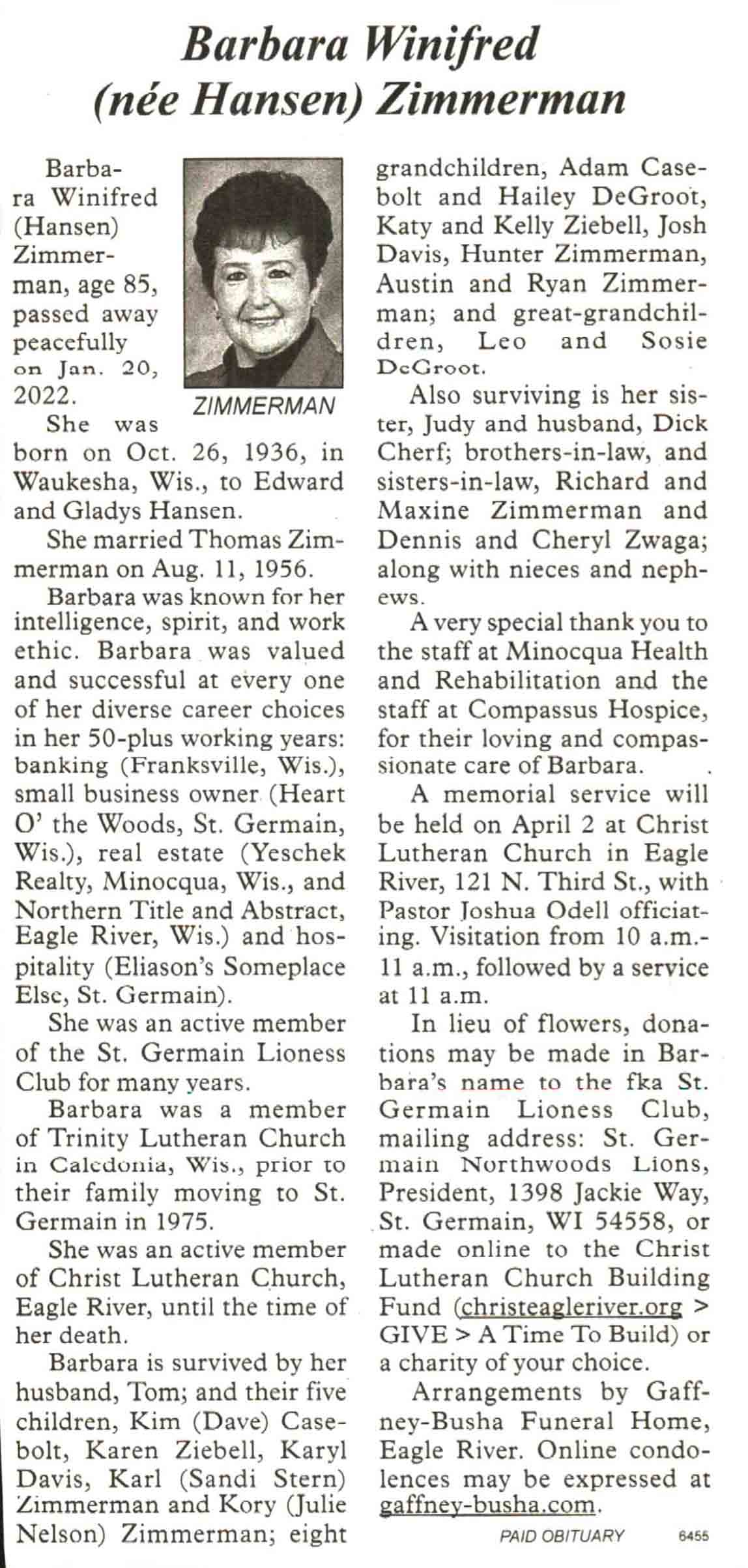 | Zimmerman | Barbara Winifred (Hansen) #2 | 26 Oct 1936 | 20 Jan 2022 | VCNR | 02 Feb 2022 | 4A |
