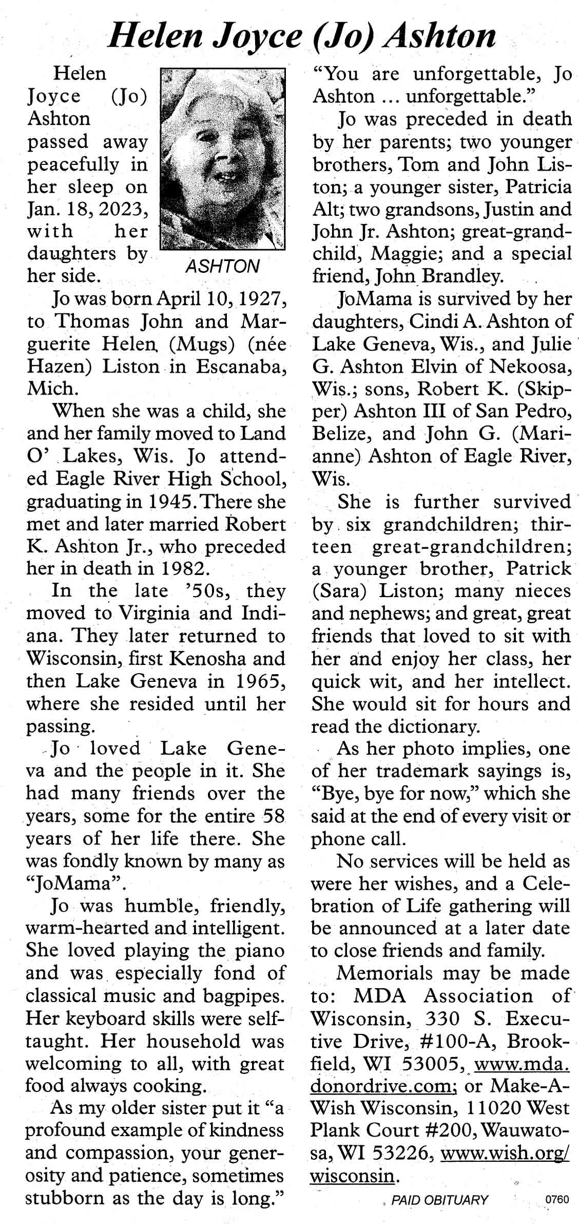 | Ashton | Helen Joyce 'Jo' (Liston) | 10 Apr 1927 | 18 Jan 2023 | VNCR | 25 Jan 2023 | 6A |