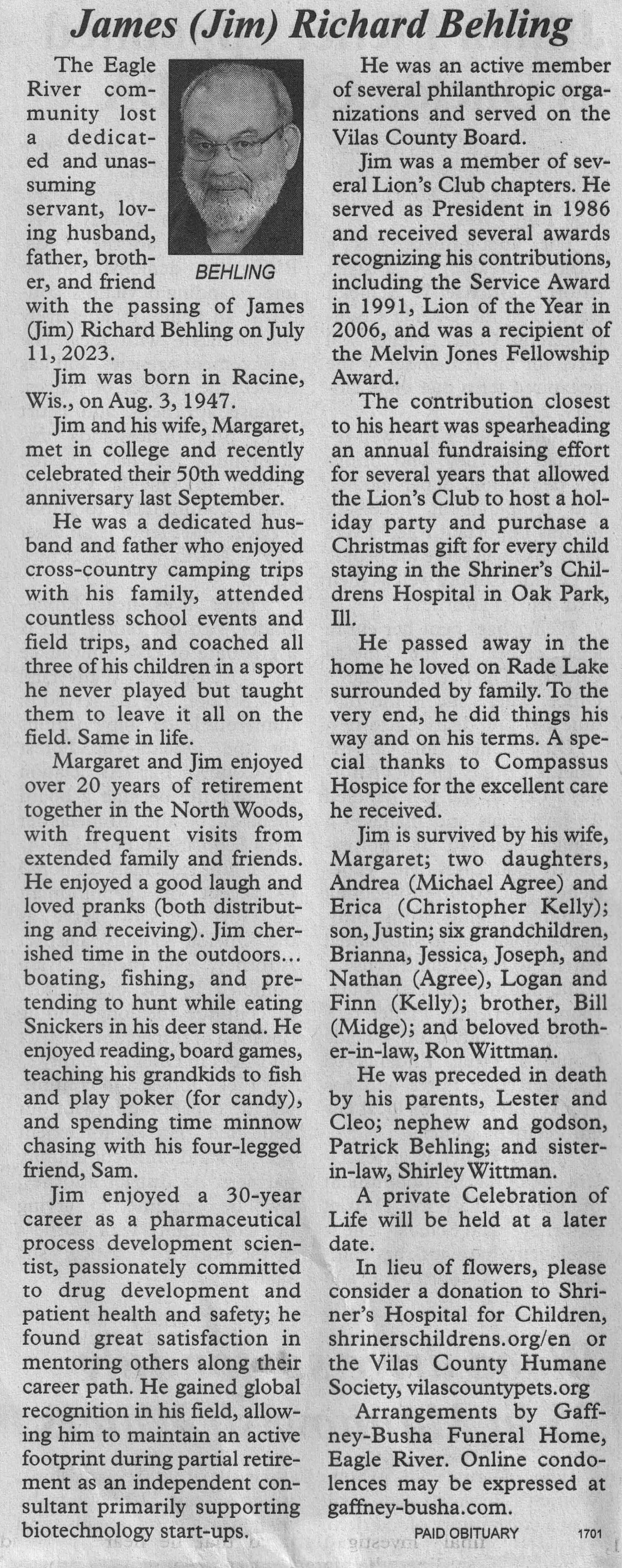 | Behling | James Richard 'Jim' | 03 Aug 1947 | 11 Jul 2023 | VNCR | 19 Jul 2023 | 4A |