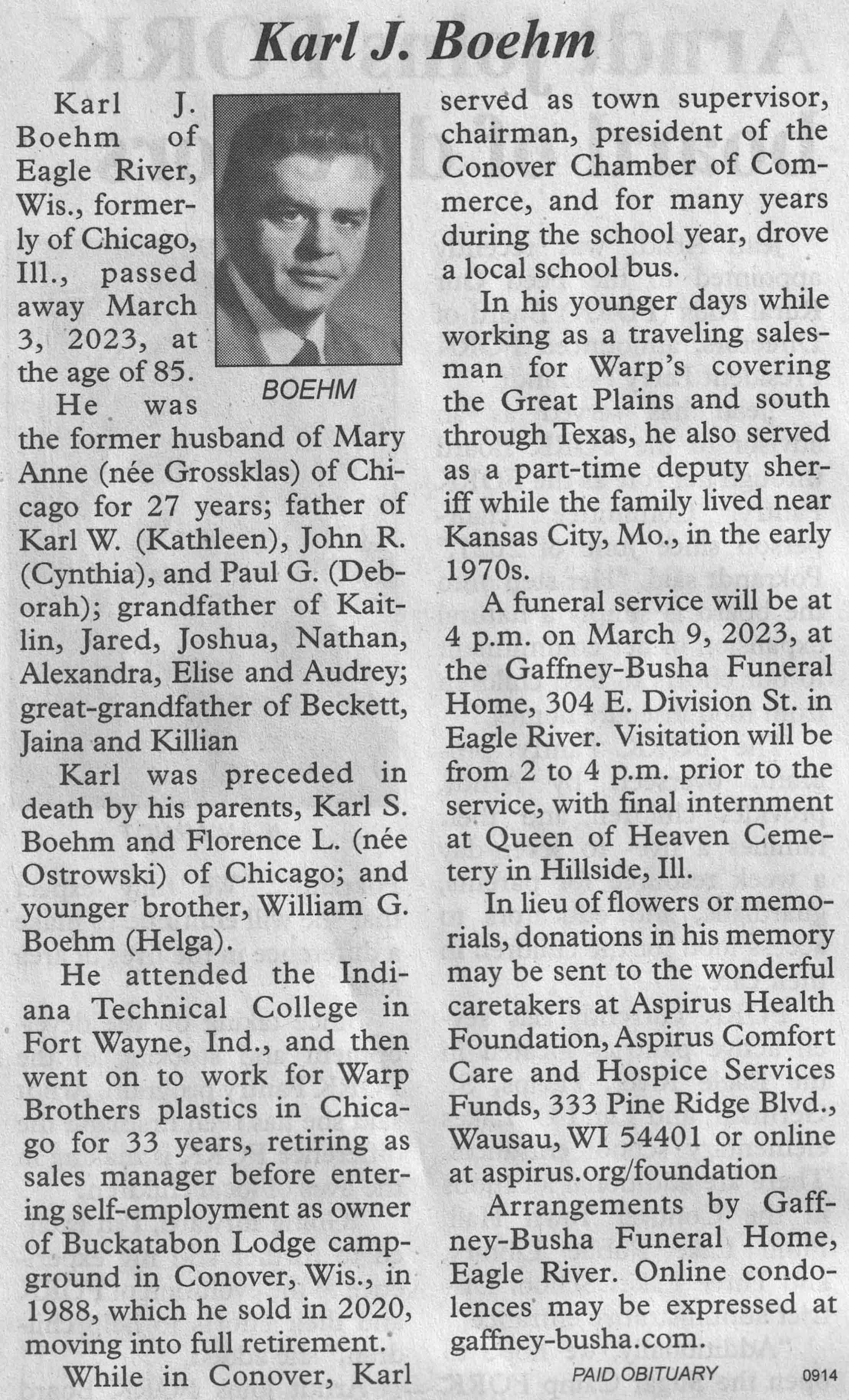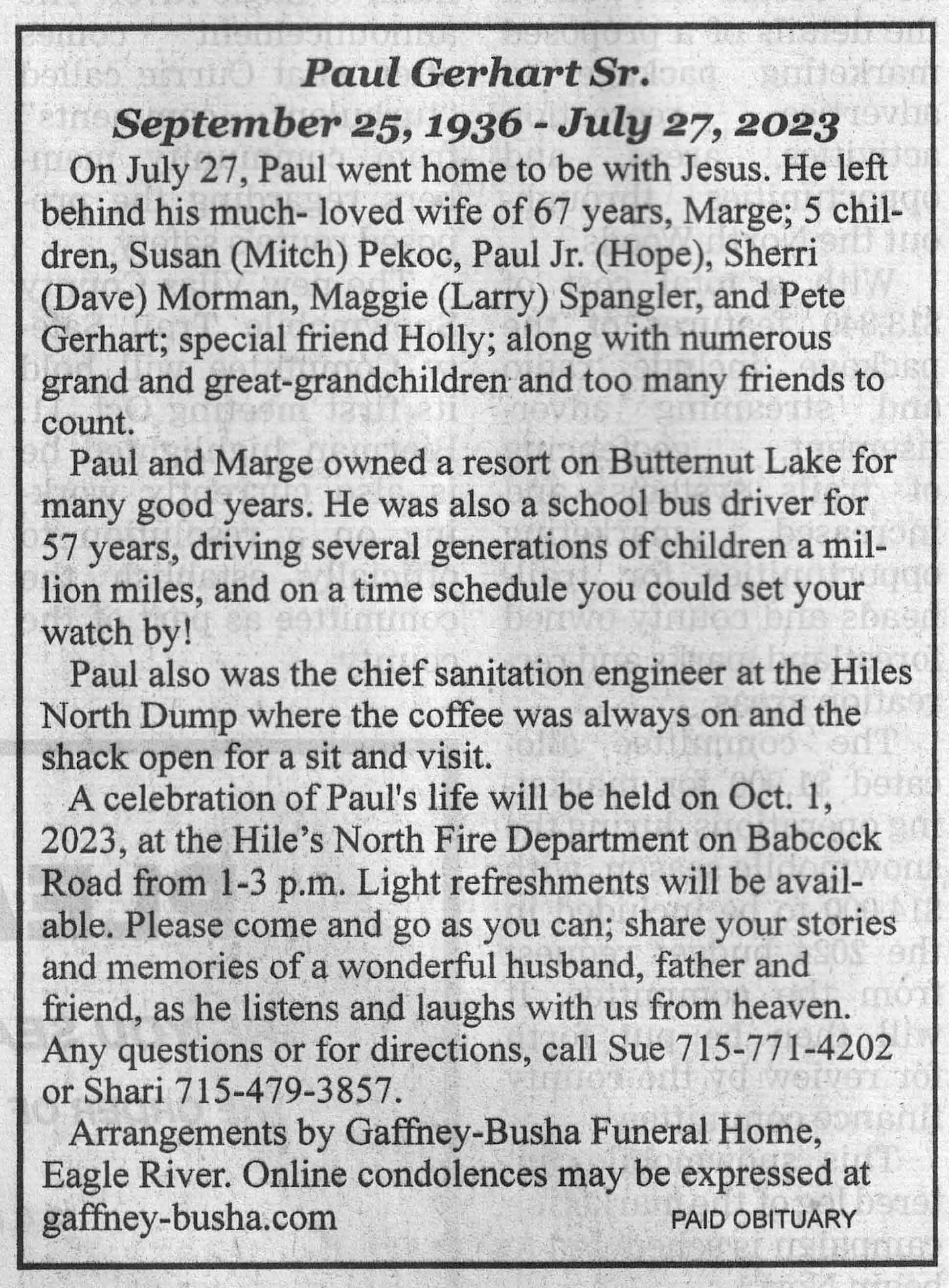 | Gerhart | Paul, Sr | 25 Sep 1936 | 27 Jul 2023 | VNCR | 09 Aug 2023 | 4A |
