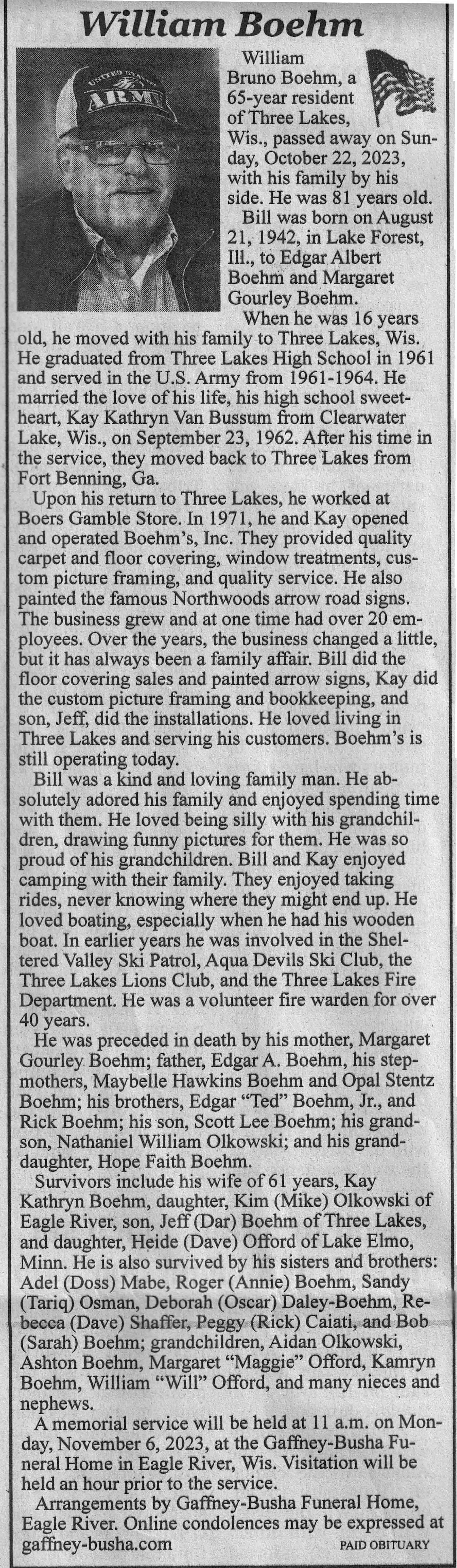 | Boehm | William Bruno | 21 Aug 1942 | 22 Oct 2023 | VNCR | 01 Nov 2023 | 4A |