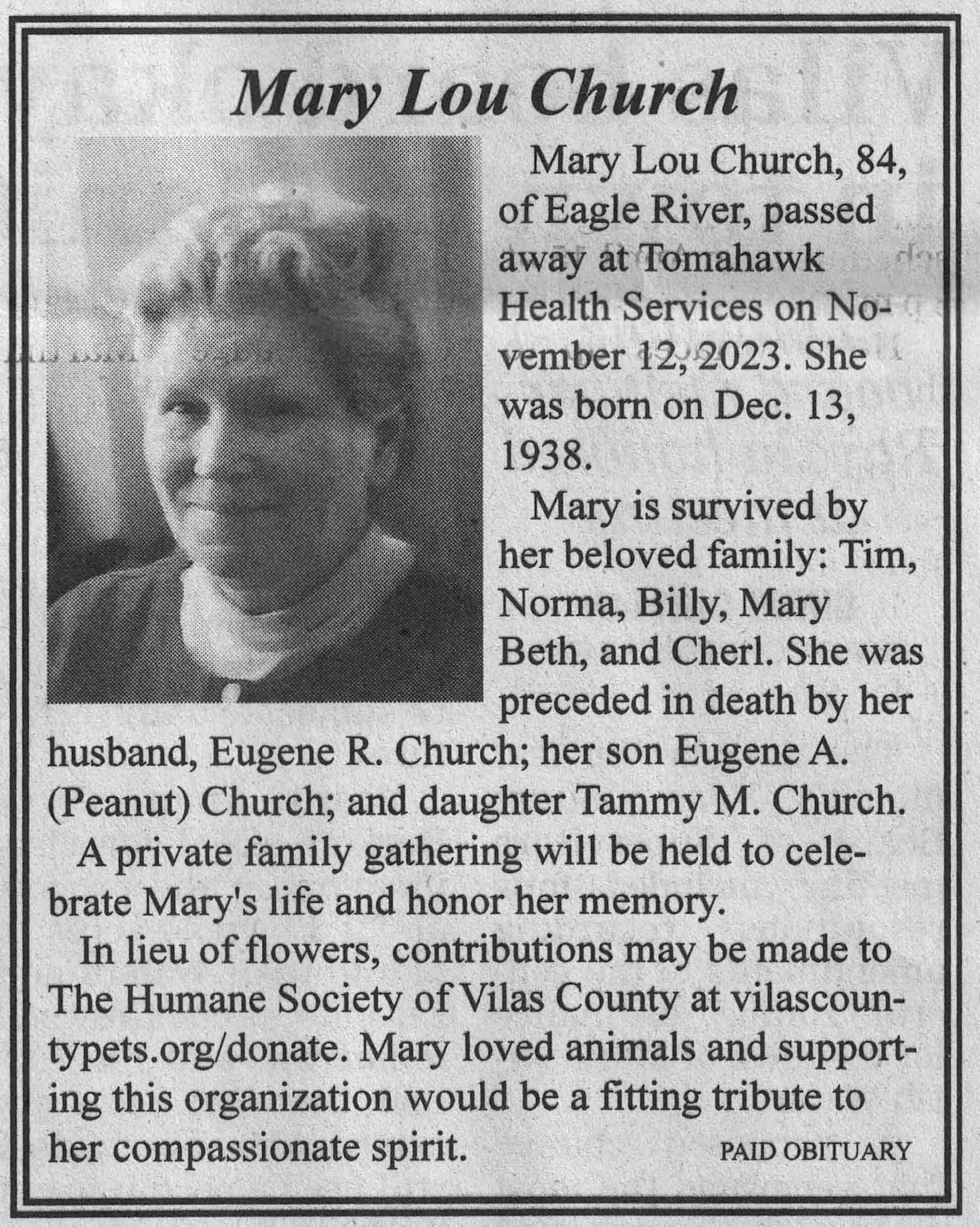 | Church | Mary Lou | 13 Dec 1938 | 12 Nov 2023 | VNCR | 07 Feb 2024 | 4A |