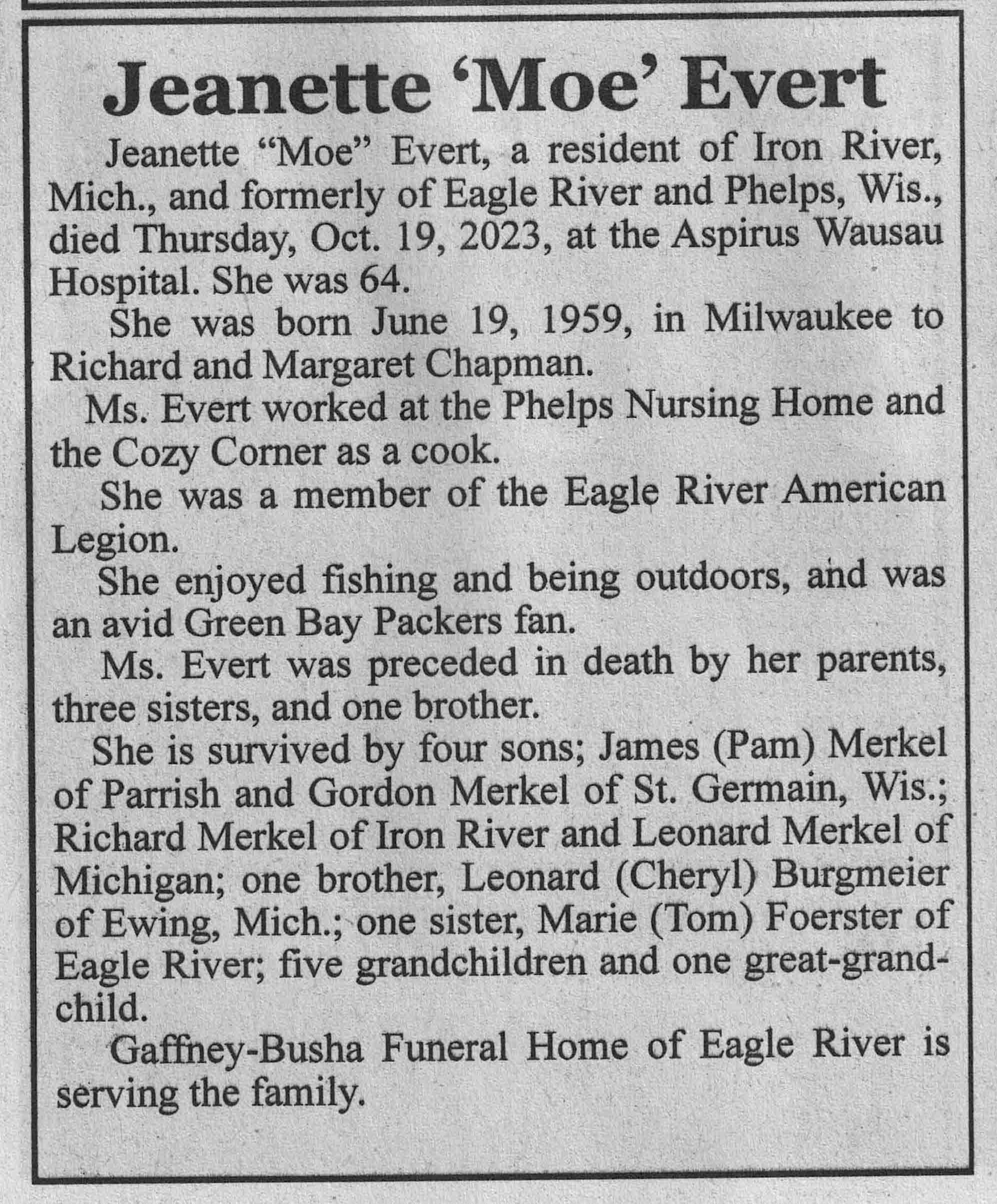 | Evert | Jeanette 'Moe' (Chapman) | 19 Jun 1959 | 19 Oct 2023 | VNCR | 25 Oct 2023 | 4A |