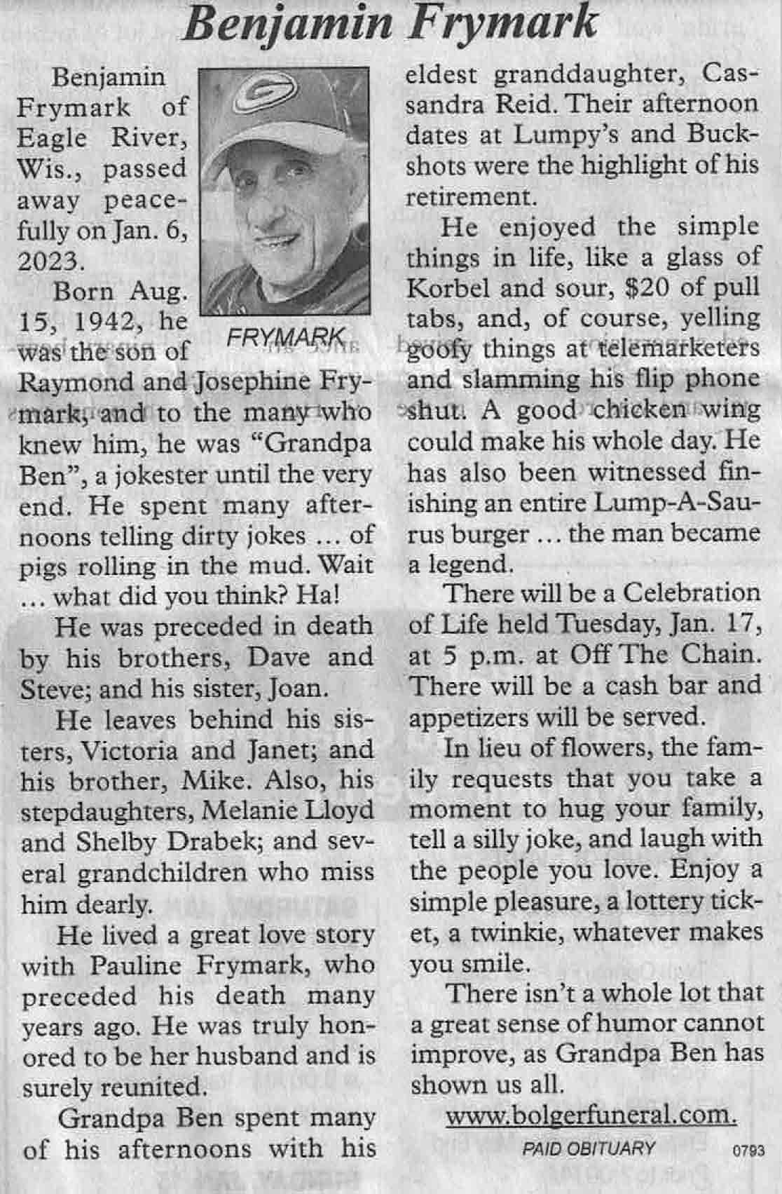 | Frymark | Benjamin | 15 Aug 1942 | 06 Jan 2023 | VNCR | 11 Jan 2023 | 4A |
