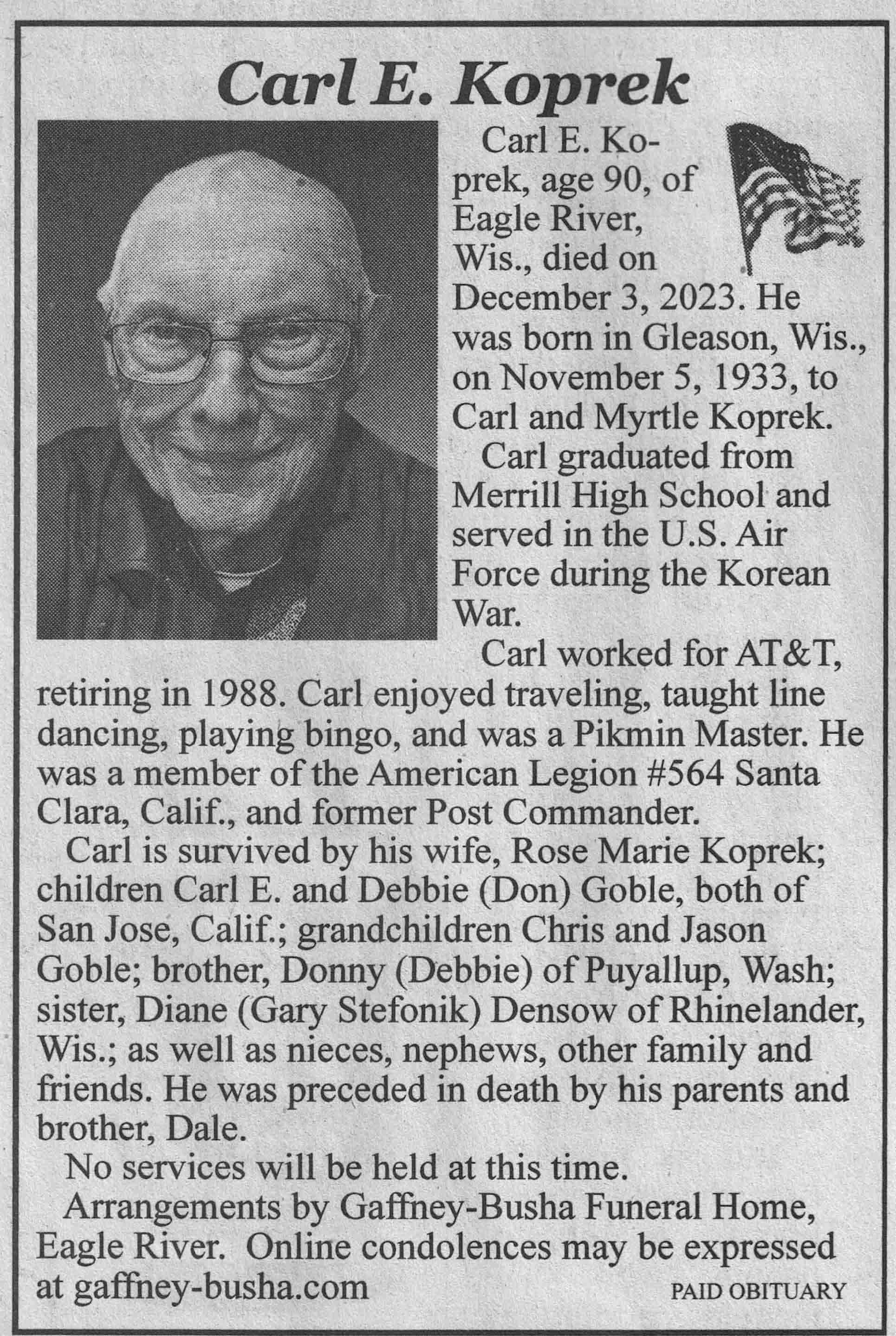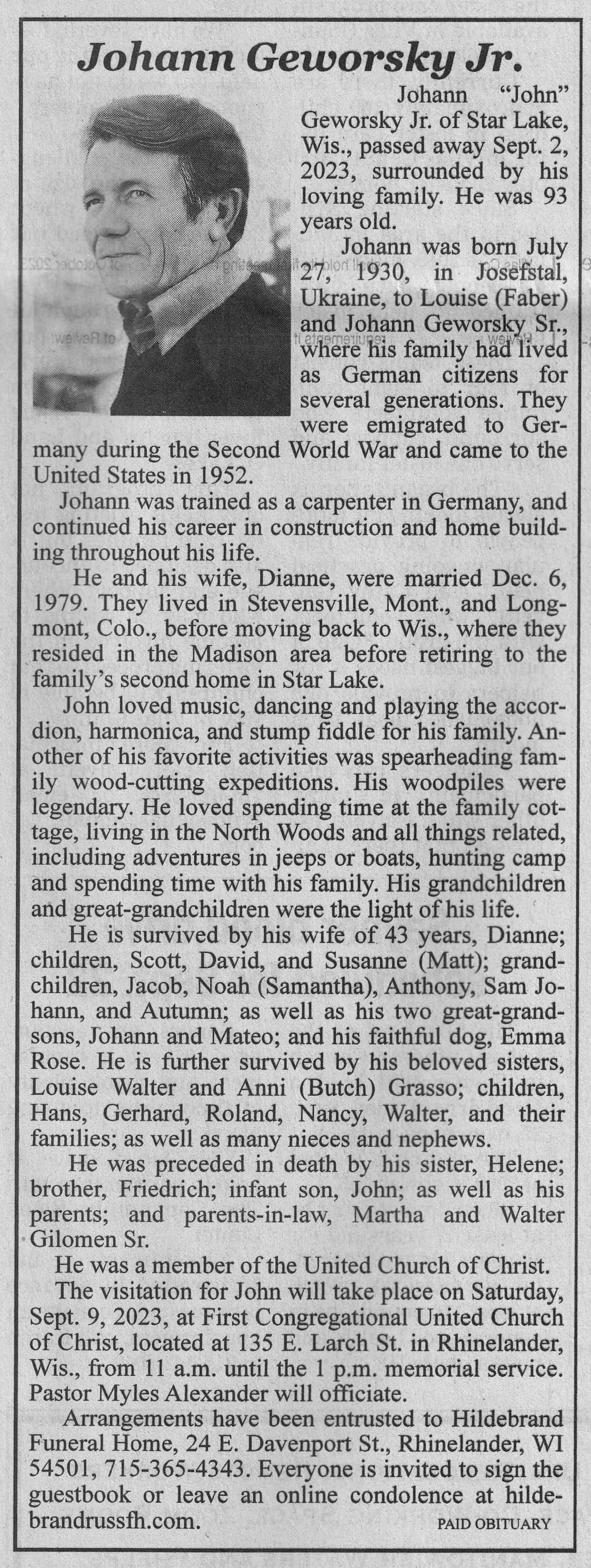 | Geworsky | Johann, Jr "John" | 27 Jul 1930 | 02 Sep 2023 | VNCR | 13 Sep 2023 | 4A |