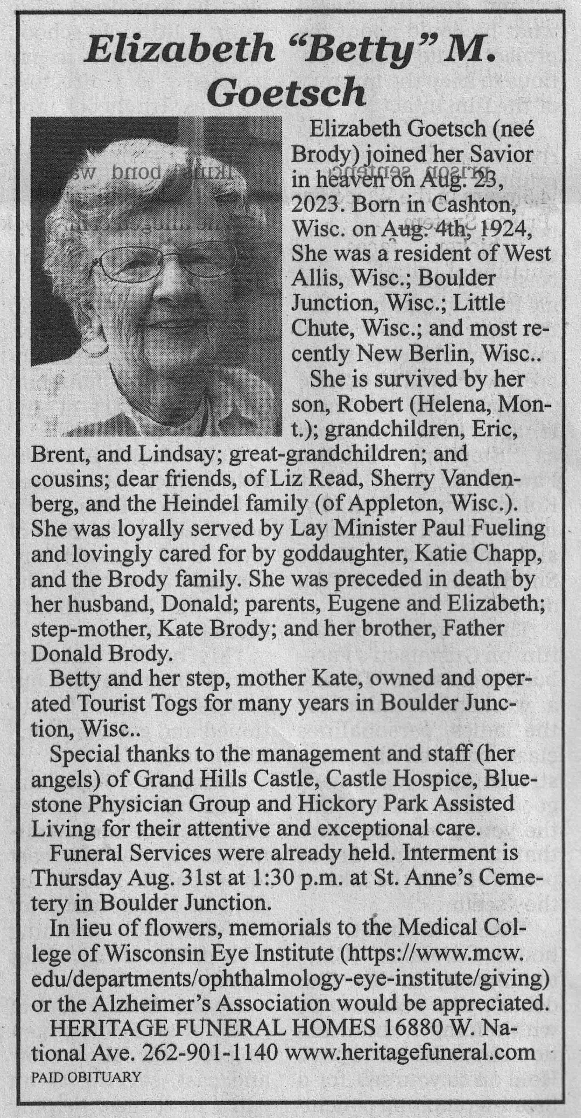 | Goetsch | Elizabeth M "Betty" (Brody) | 04 Aug 1924 | 23 Aug 2023 | VNCR | 30 Aug 2023 | 4A |