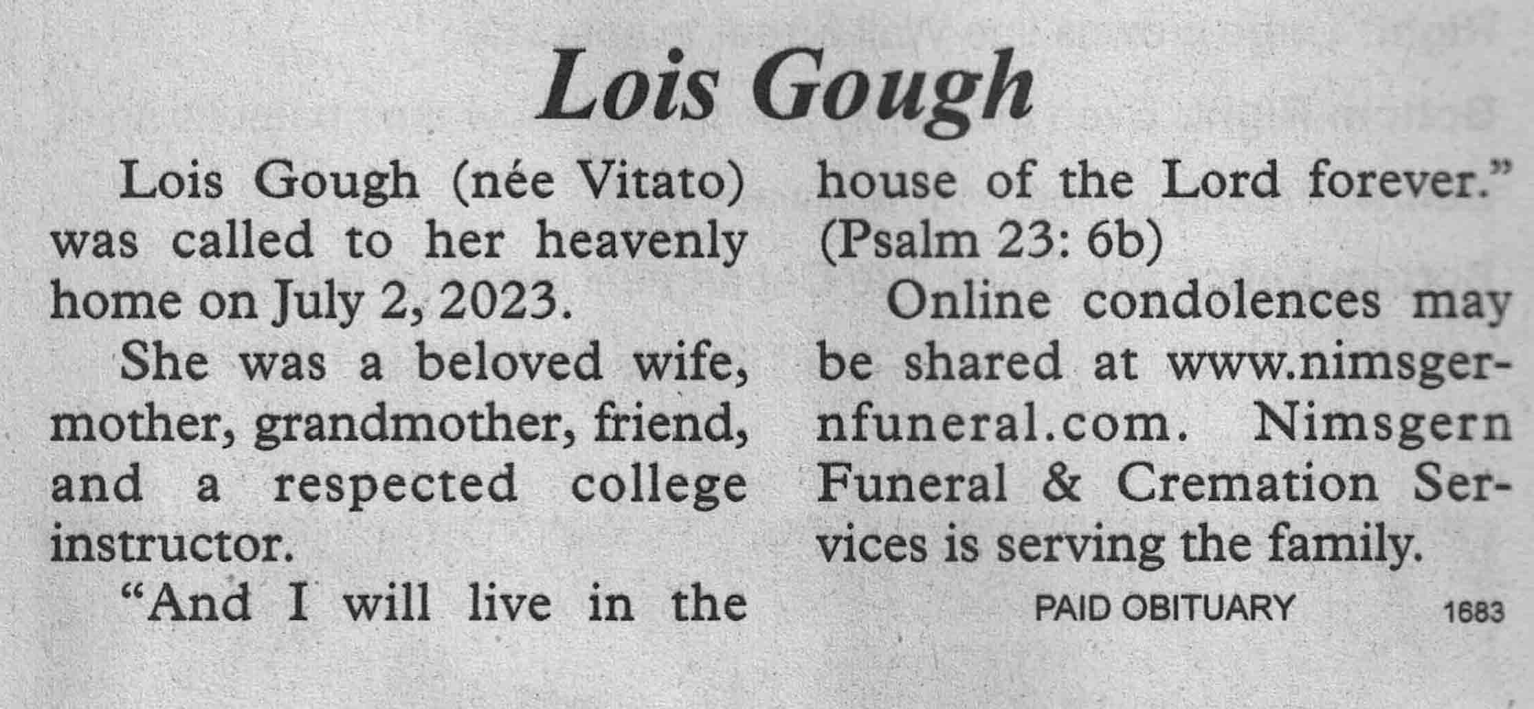 | Ferrazzano | Frances 'Fran' (Pardew) | 09 Mar 1946 | 23 Jul 2023 | VNCR | 09 Aug 2023 | 4A |