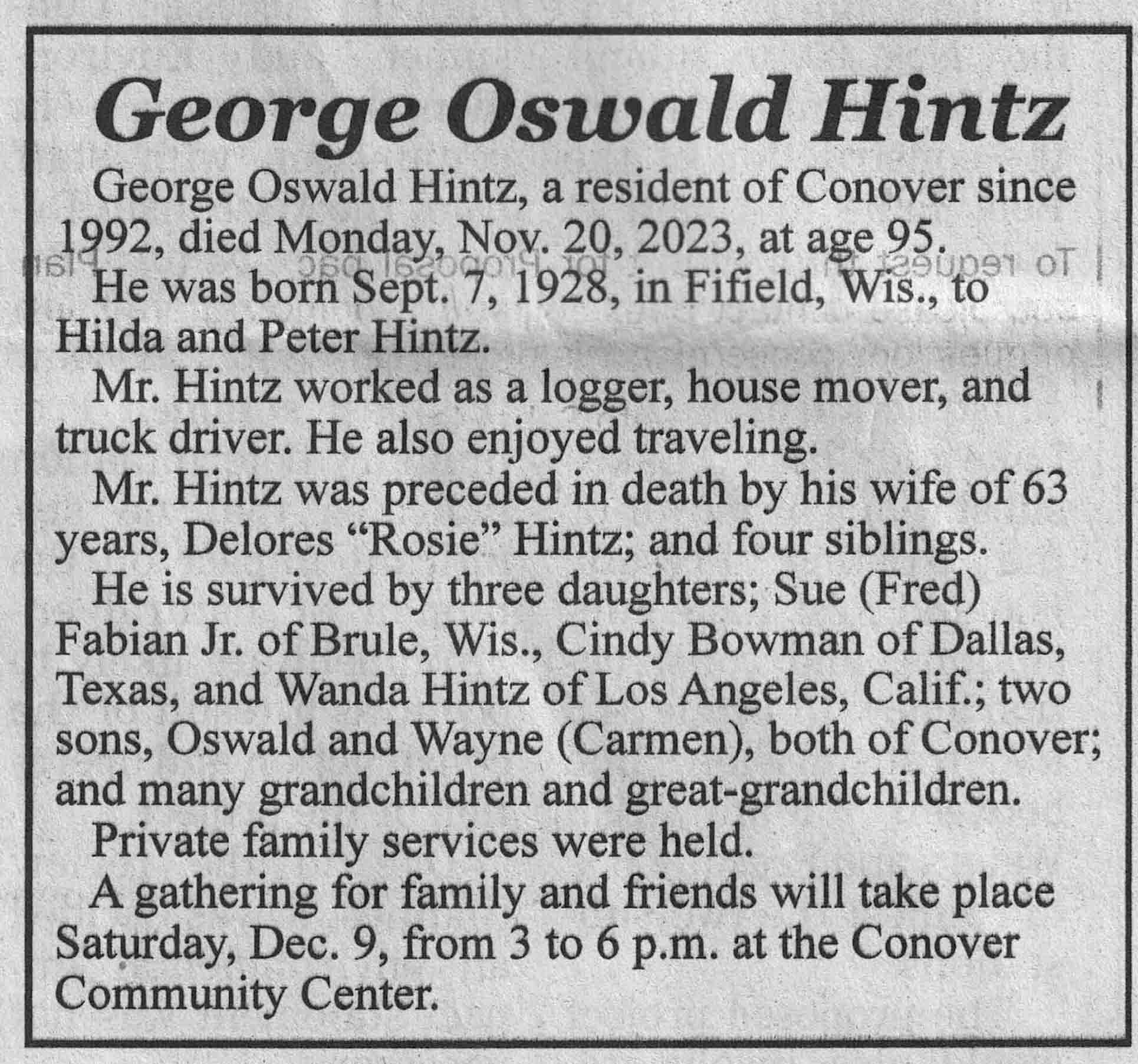 | Hintz | George Oswald | 07 Sep 1928 | 20 Nov 2023 | VNCR | 29 Nov 2023 | 4A |