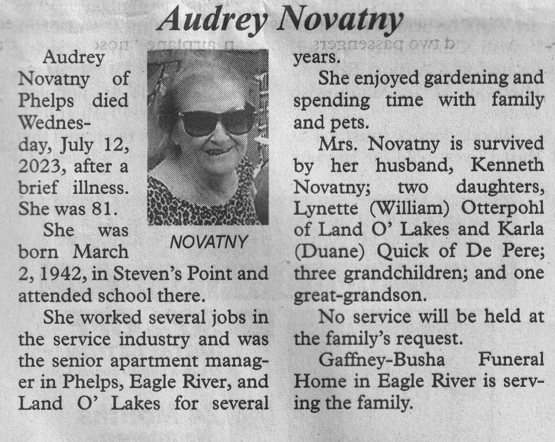| Novatny | Audrey | 02 Mar 1942 | 12 Jul 2023 | VNCR | 19 Jul 2023 | 4A |