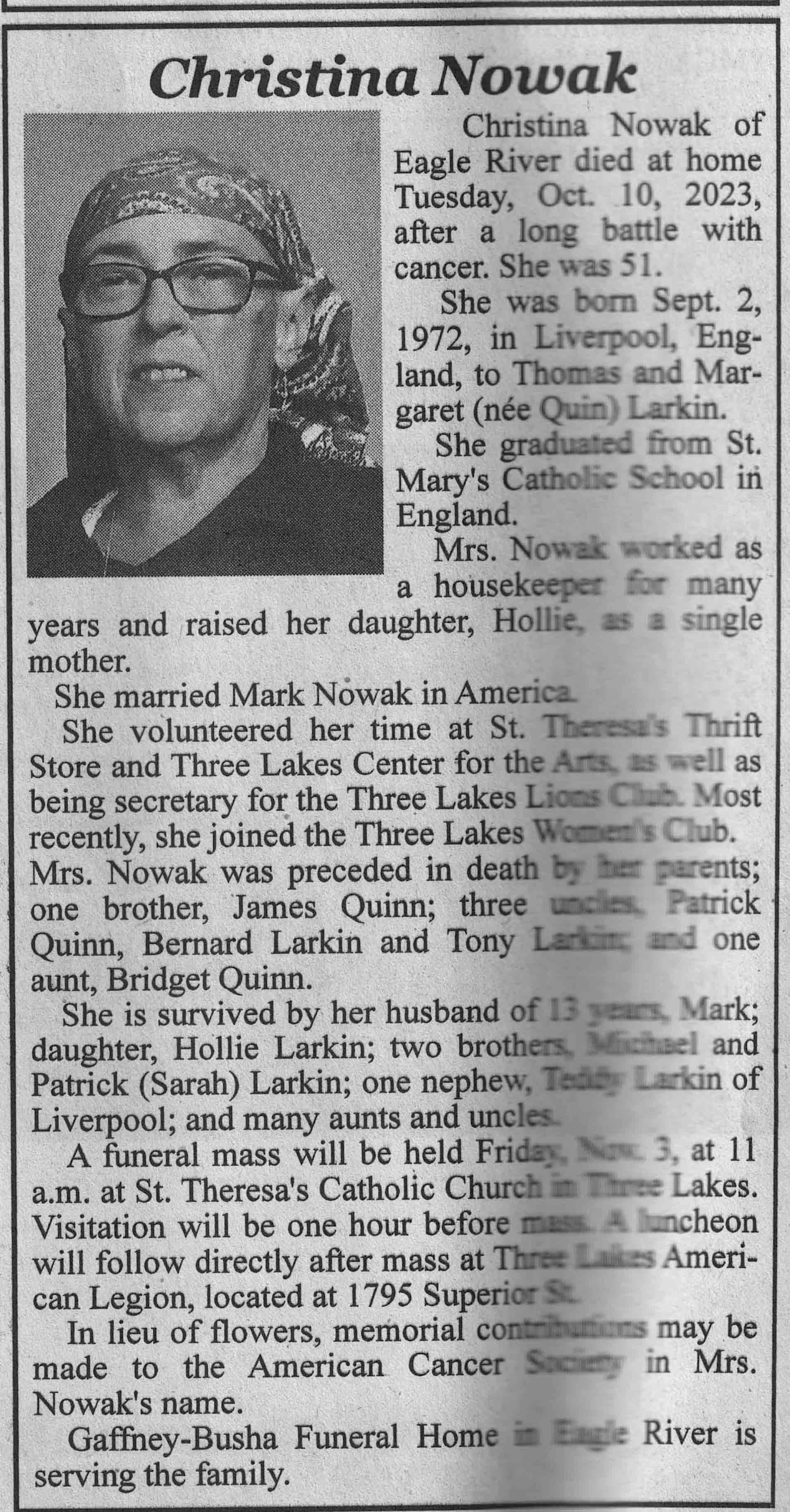 | Nowak | Christina (Larkin) | 02 Sep 1972 | 10 Oct 2023 | VNCR | 18 Oct 2023 | 4A |