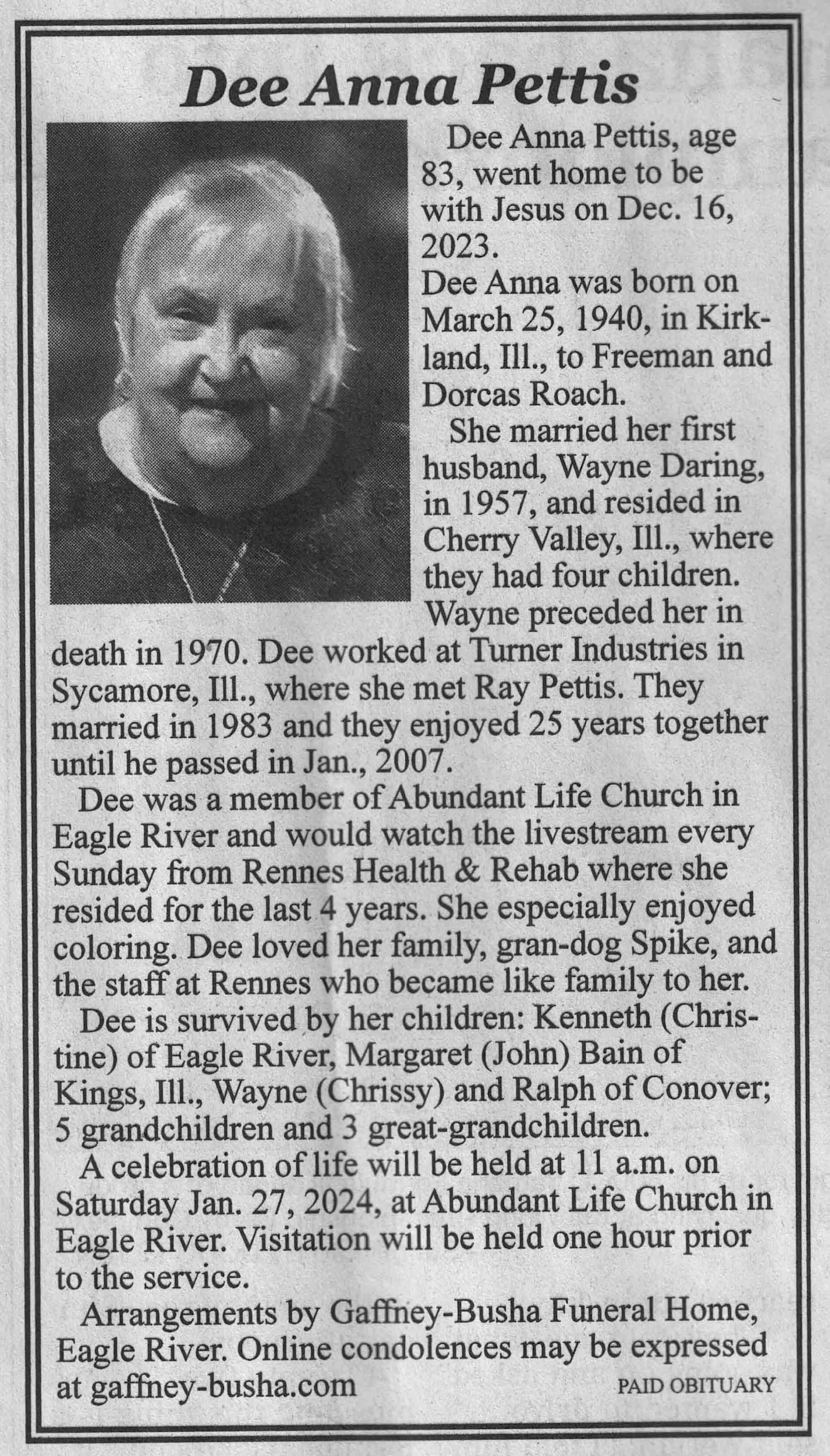 | Pettis | Dee Anna (Roach) | 25 Mar 1940 | 16 Dec 2023 | VNCR | 24 Jan 2024 | 4A |