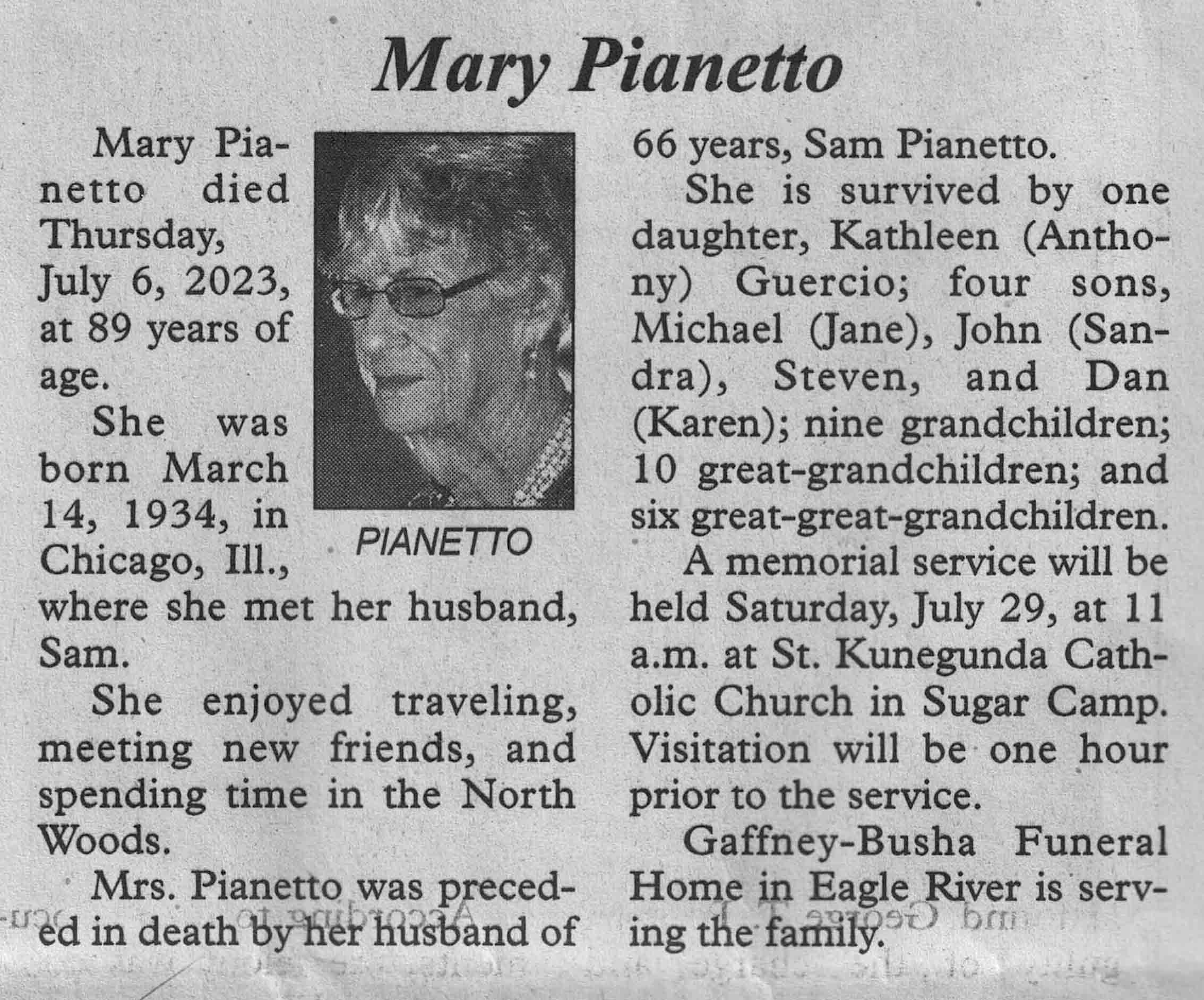 | Pianetto | Mary | 14 Mar 1934 | 06 Jul 2023 | VNCR | 12 Jul 2023 | 4A |