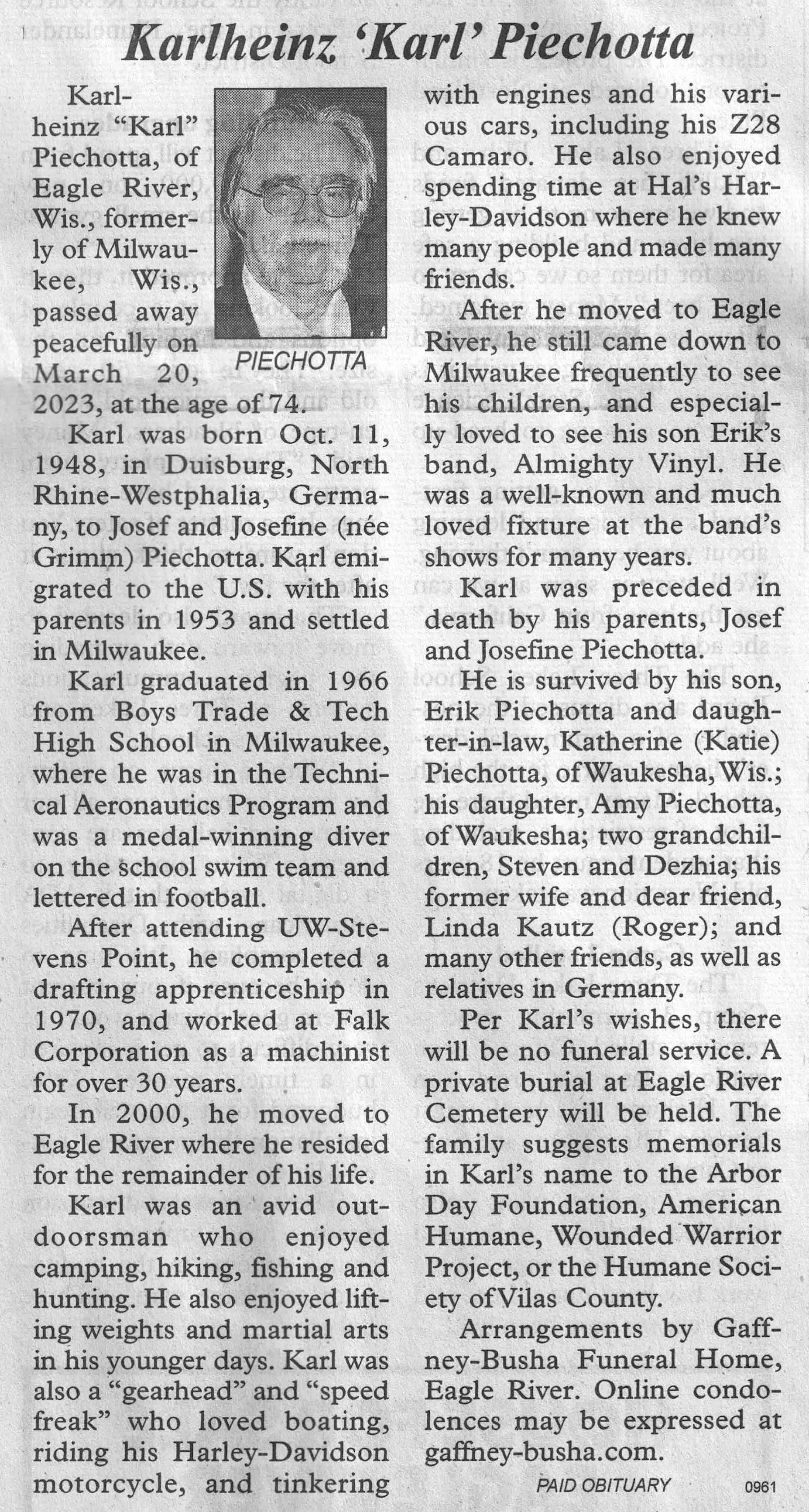 | Piechotta | Karlheinz 'Karl' | 11 Oct 1948 | 20 Mar 2023 | VNCR | 29 Mar 2023 | 4A |