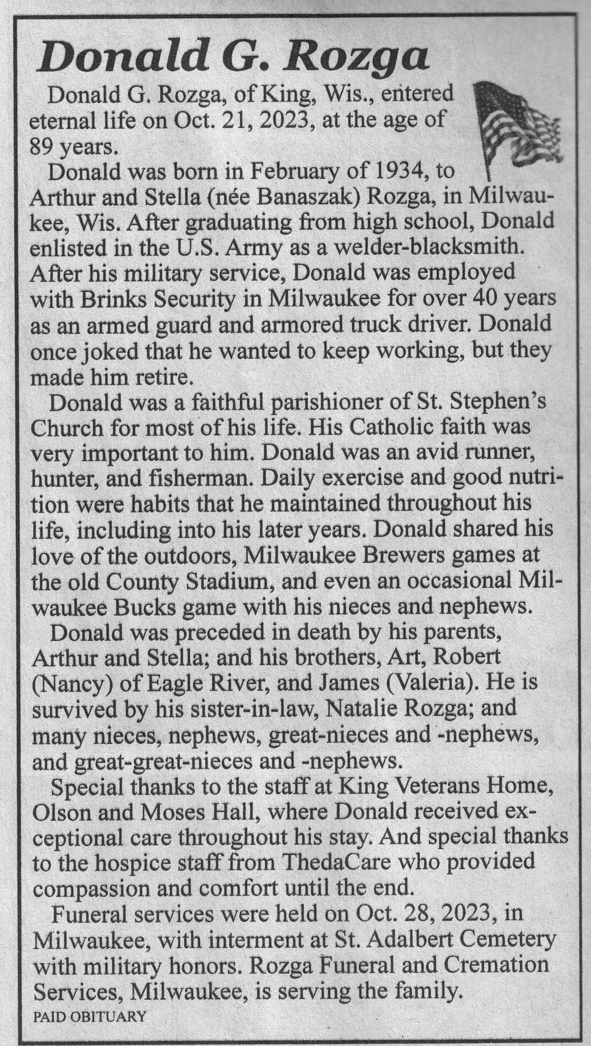 | Rozga | Donald G | Feb 1934 | 21 Oct 2023 | VNCR | 08 Nov 2023 | 4A |