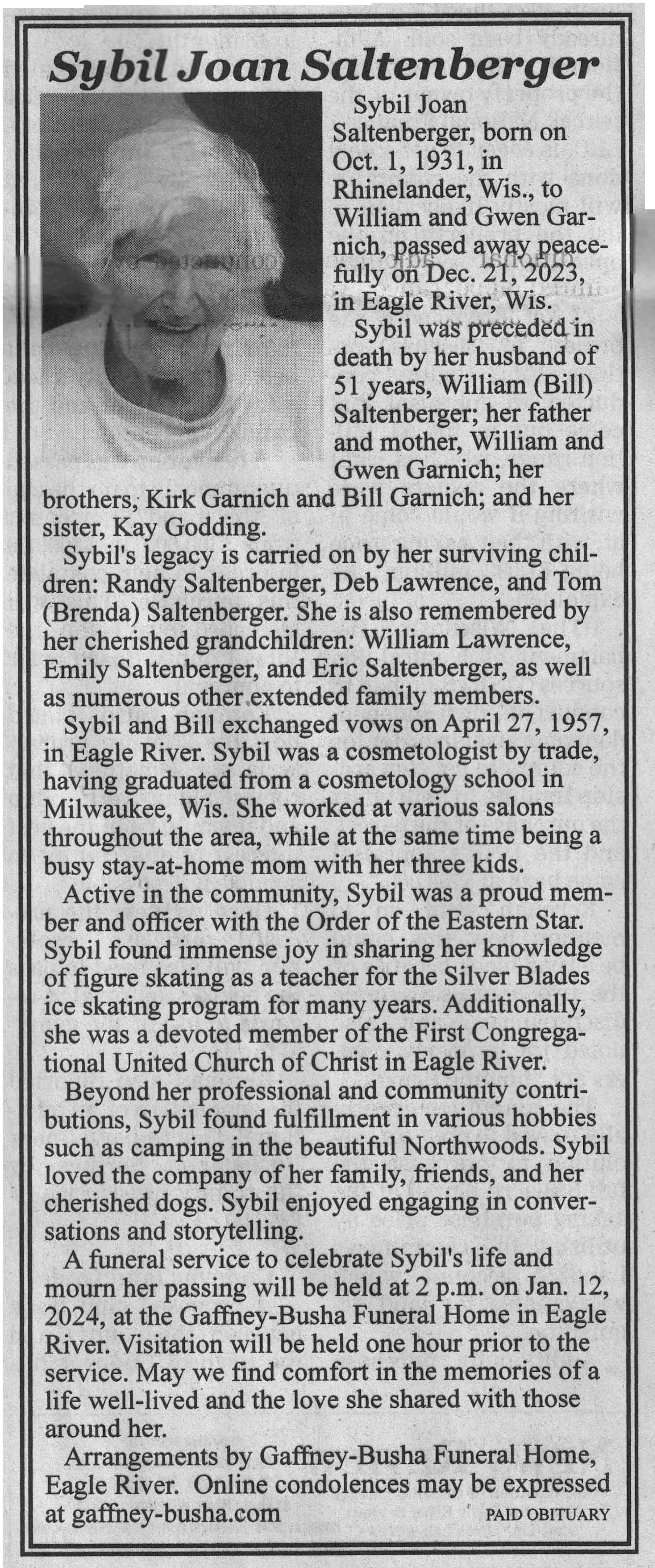 | Saltenberger | Sybil Joan (Garnich) | 01 Oct 1931 | 21 Dec 2023 | VNCR | 10 Jan 2024 | 4A |