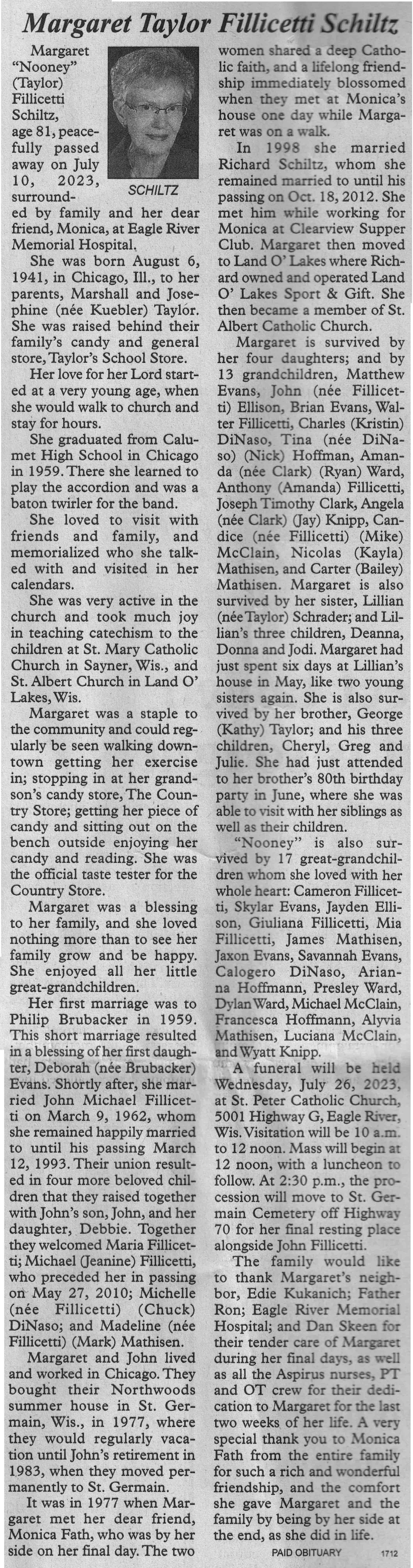 | Schlitz | Margaret (Taylor) | 06 Aug 1941 | 10 Jul 2023 | VNCR | 26 Jul 2023 | 4A |