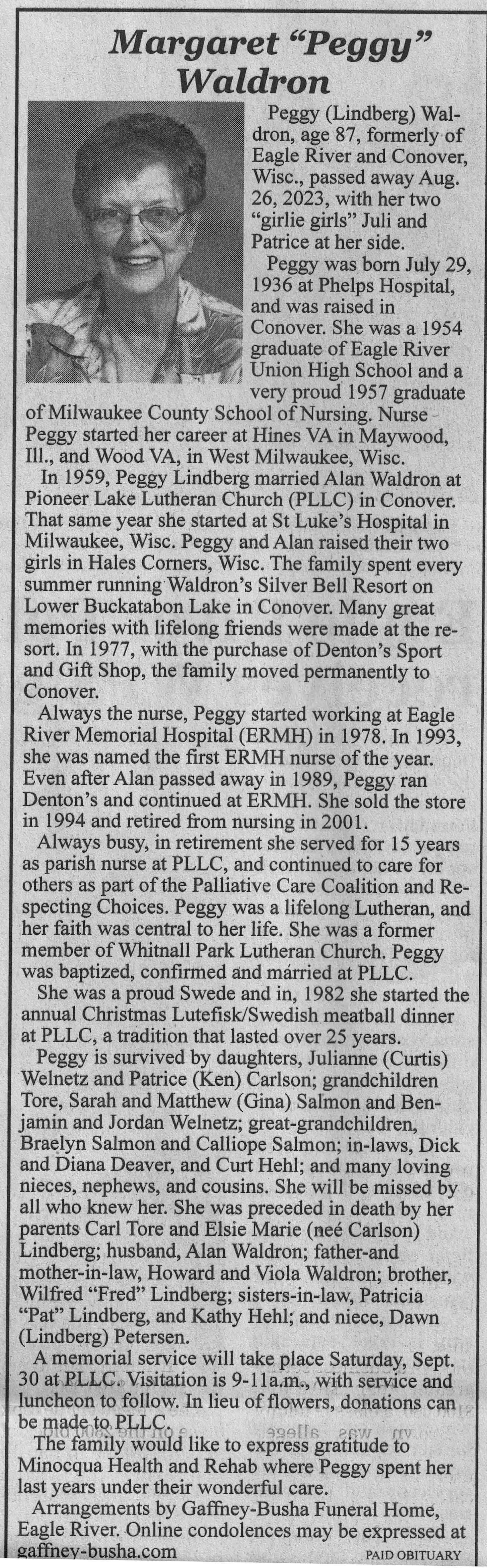 | Waldron | Margaret "Peggy" (Lindberg) | 29 Jul 1936 | 26 Aug 2023 | VNCR | 06 Sep 2023 | 4A |