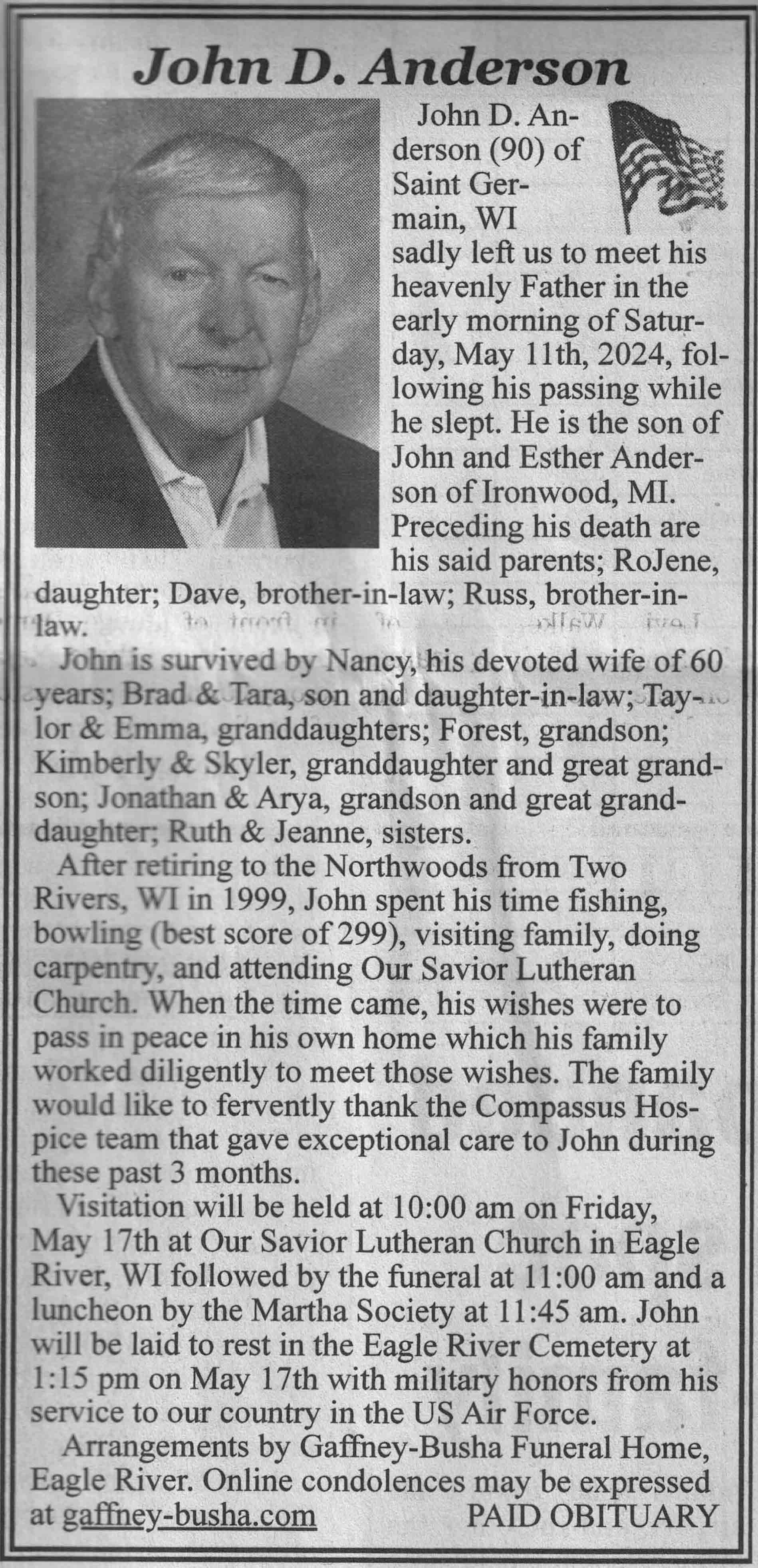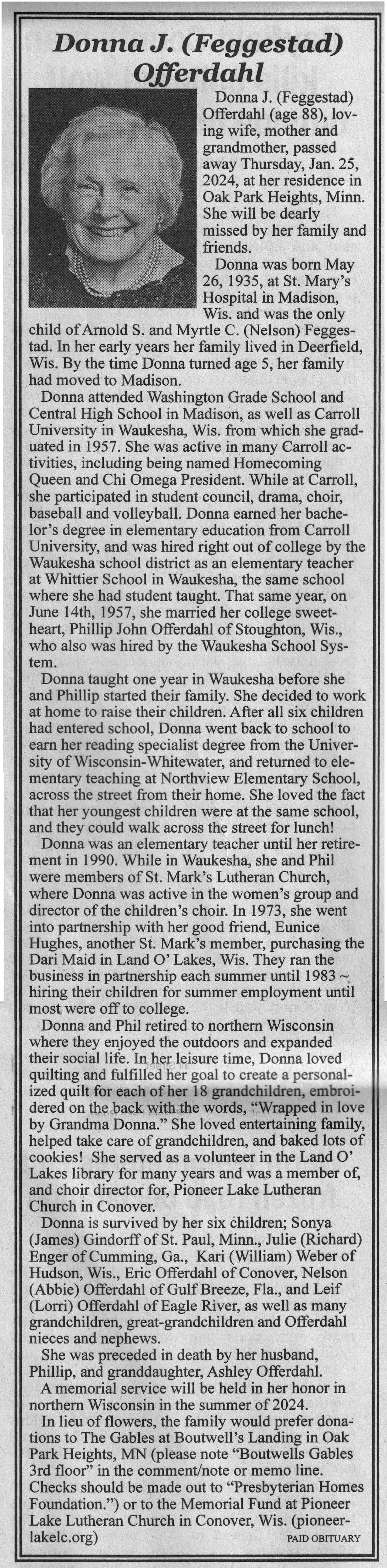 | Offerdahl | Donna J (Feggestad) | 26 May 1935 | 25 Jan 2024 | VCNR | 07 Feb 2024 | 4A |