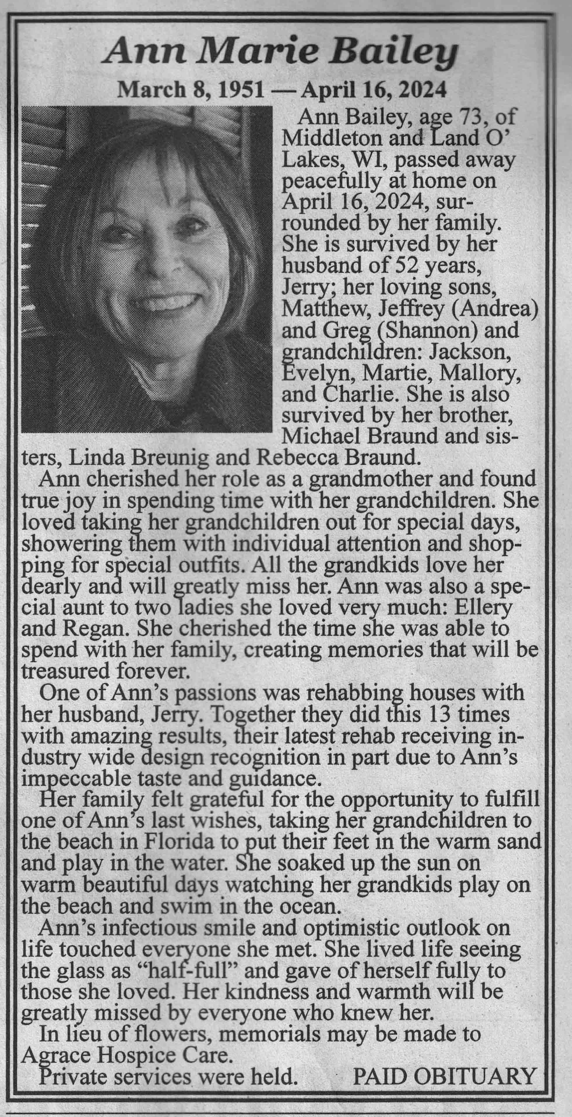 | Bailey | Ann Marie (Braund) | 08 Mar 1951 | 16 Apr 2024 | VCNR | 01 May 2024 | 4A |