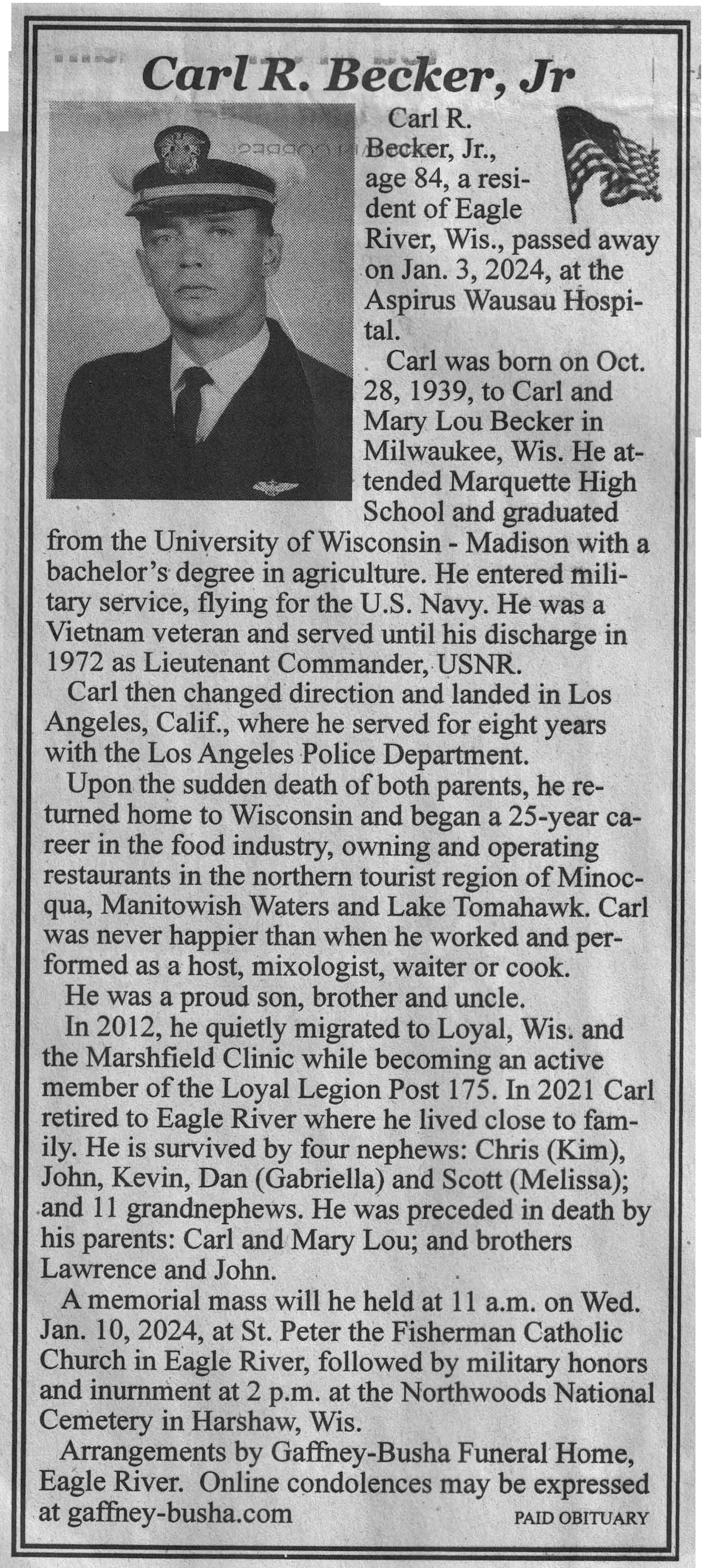 | Becker | Carl R, Jr | 28 Oct 1939 | 03 Jan 2024 | VCNR | 10 Jan 2024 | 4A |