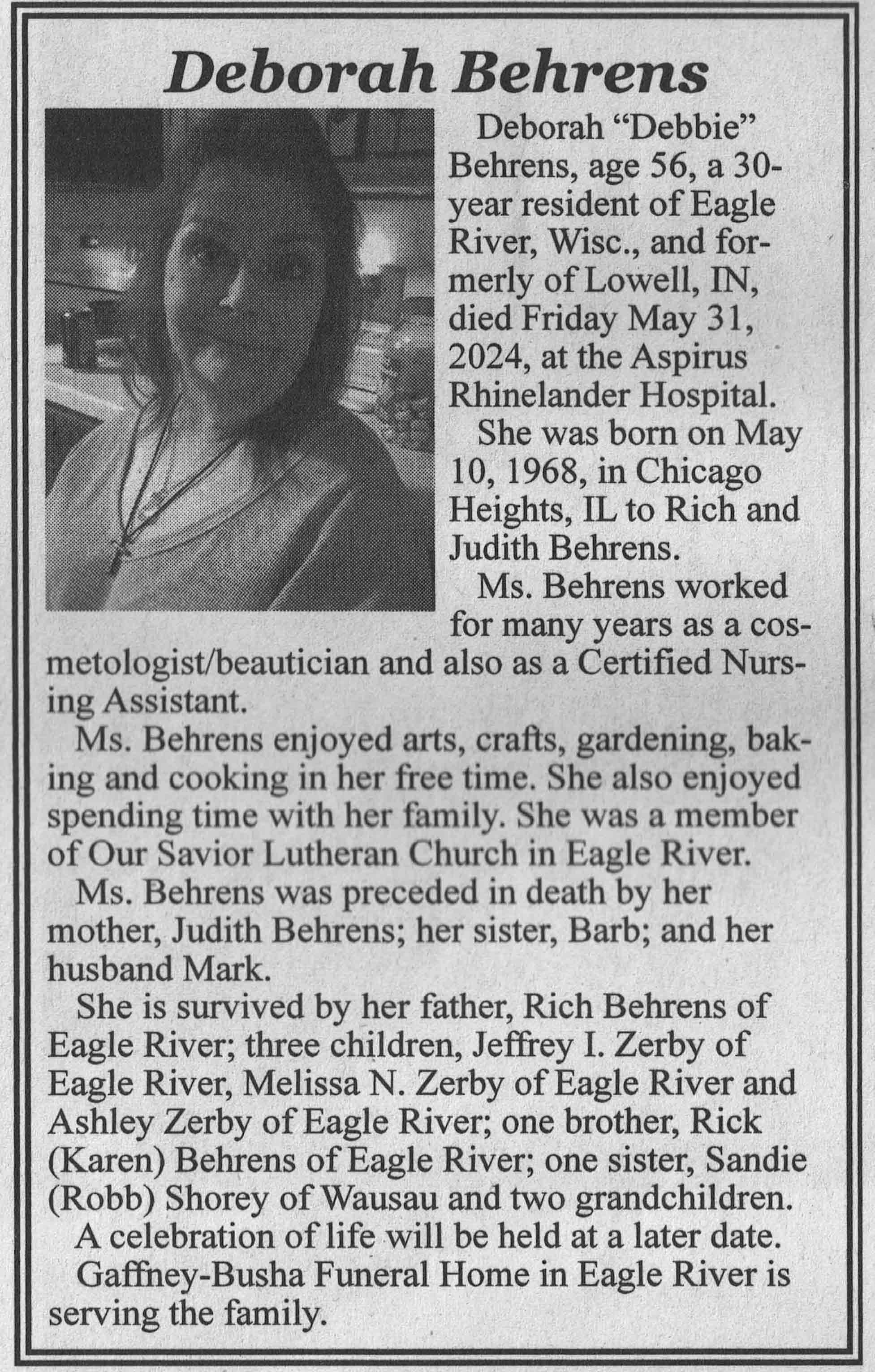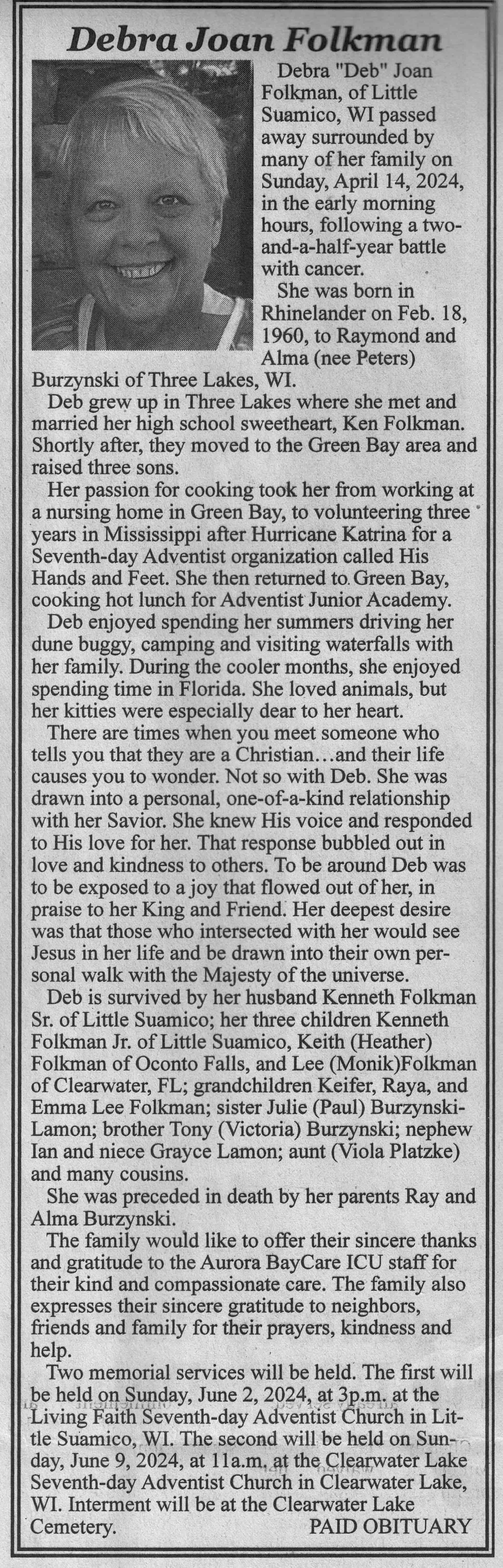 | Folkman | Debra Joan (Burzynski) | 18 Feb 1960 | 14 Apr 2024 | VCNR | 15 May 2024 | 4A |