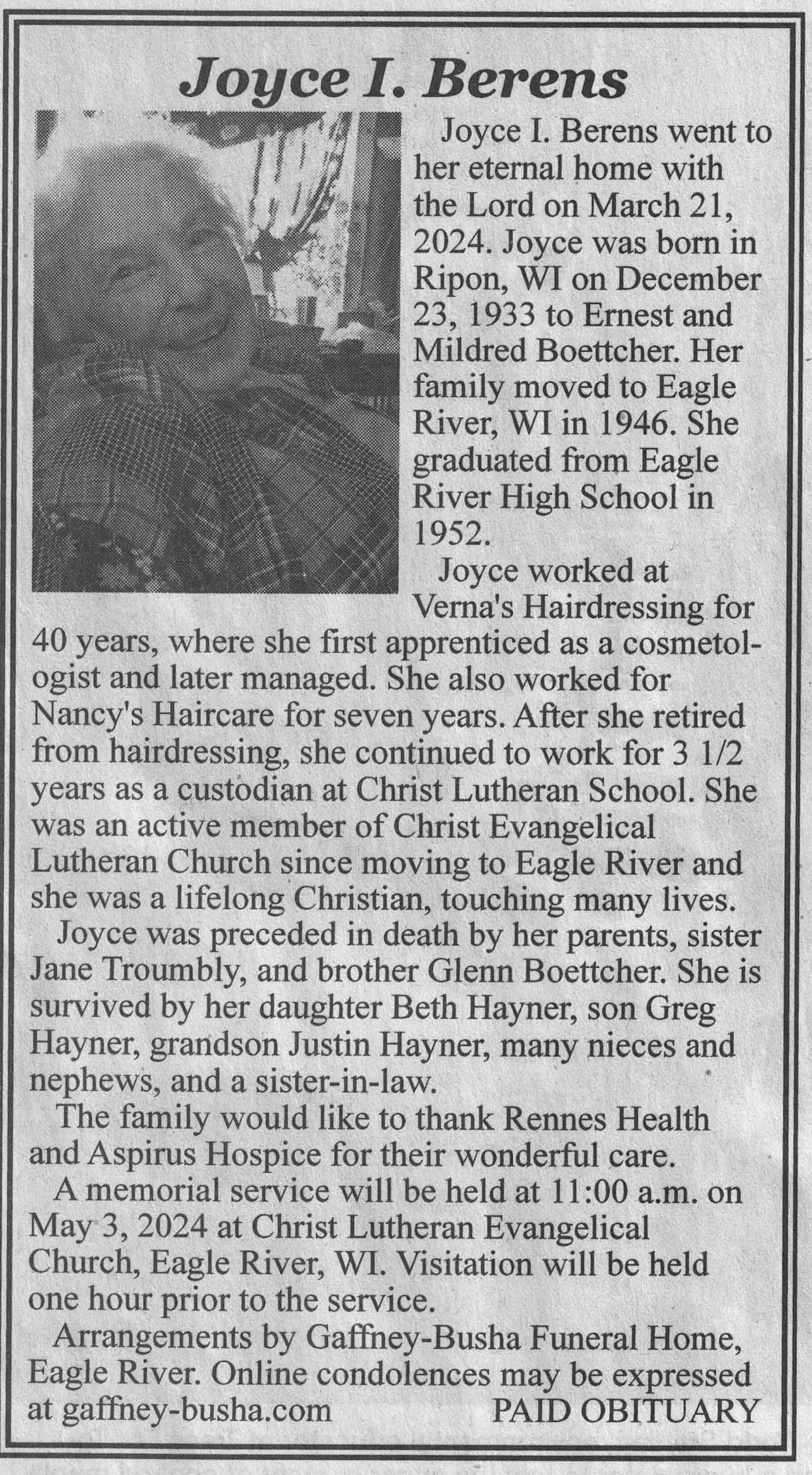 | Berens | Joyce I (Boettcher) | 23 Dec 1933 | 21 Mar 2024 | VCNR | 03 Apr 2024 | 4A |