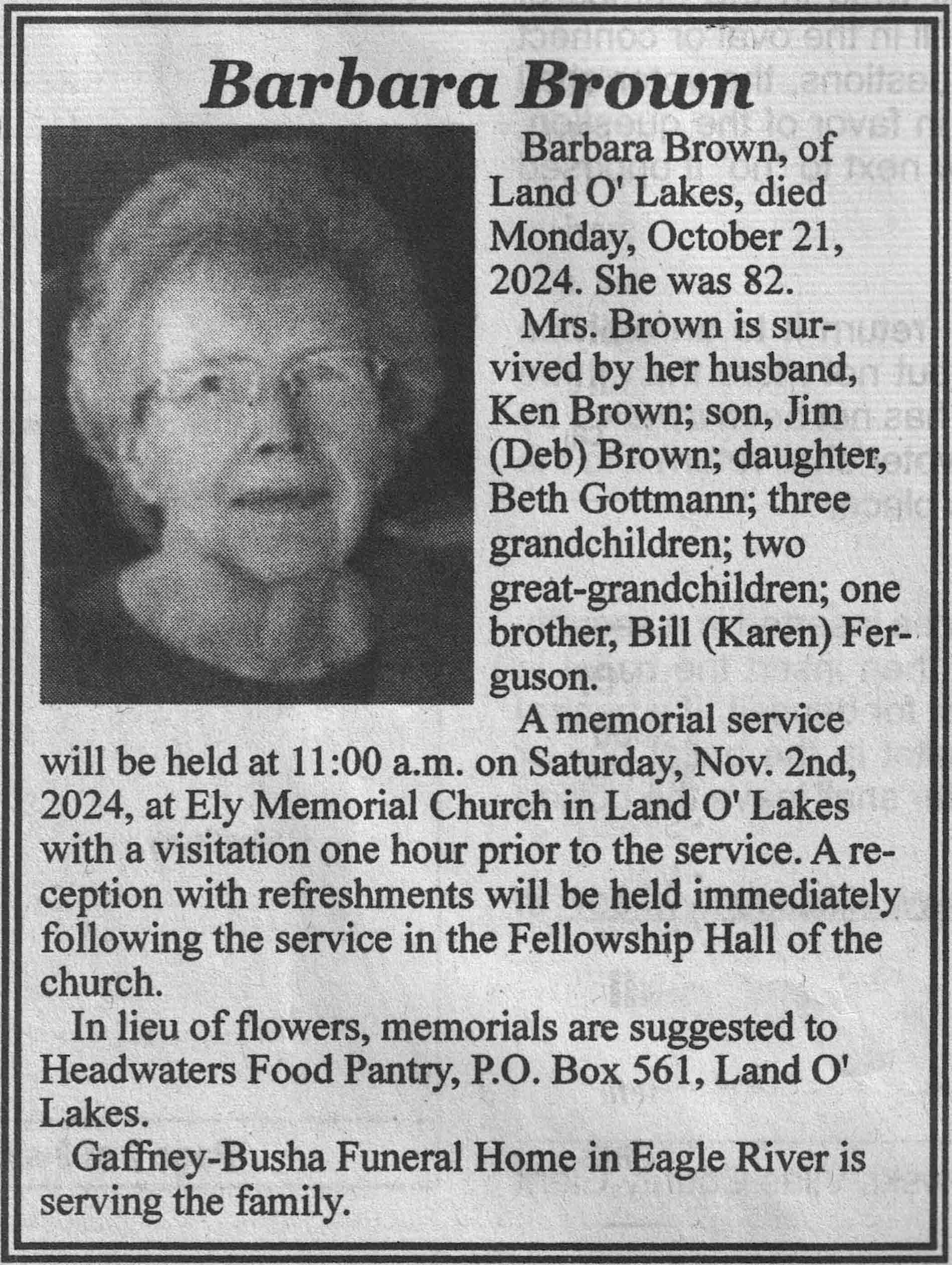 | Brown | Barbara (Ferguson) | c 1942 | 21 Oct 2024 | VCNR | 30 Oct 2024 | 5A |