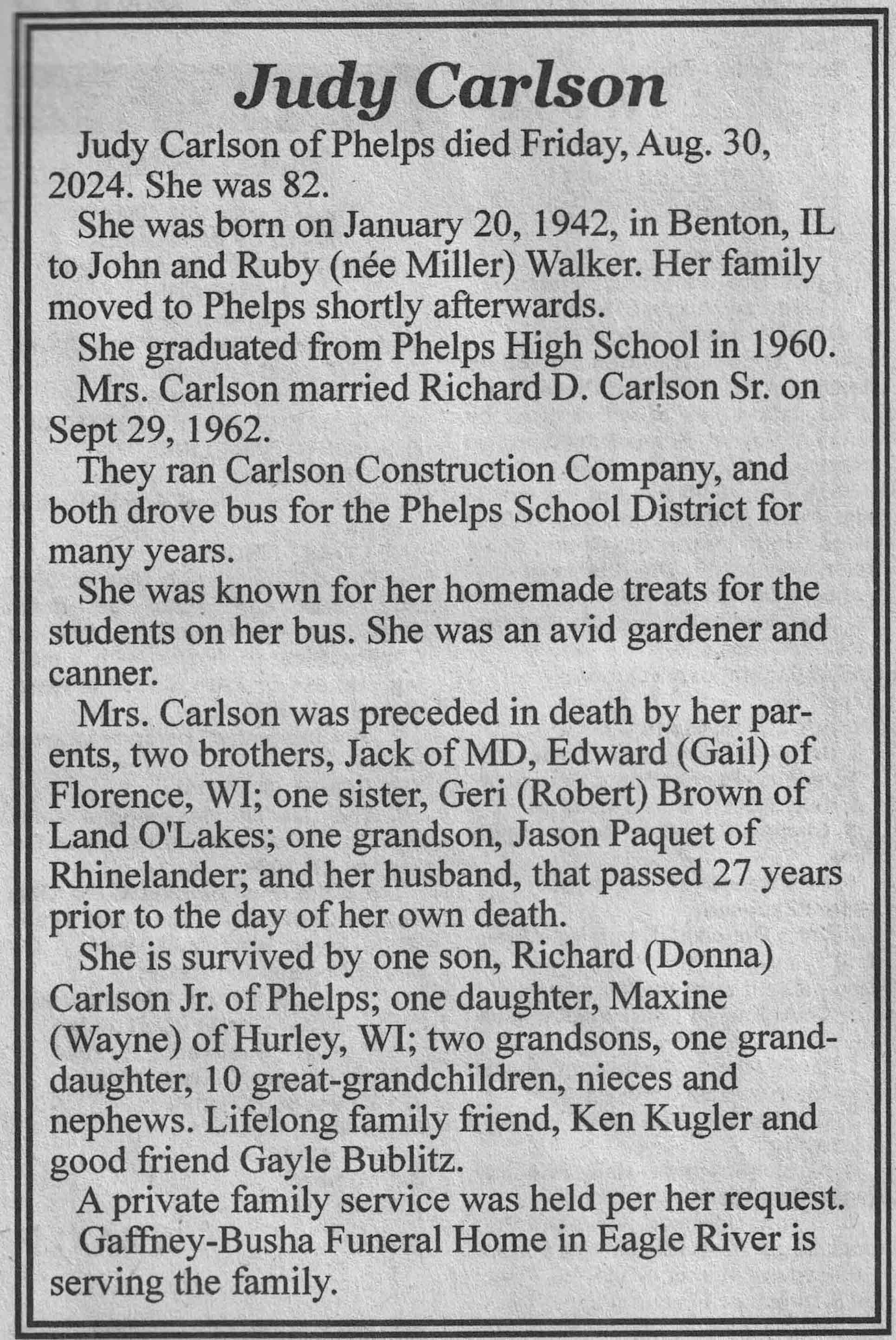 | Carlson | Judy (Walker) | 20 Jan 1942 | 30 Aug 2024 | VCNR | 16 Oct 2024 | 5A |