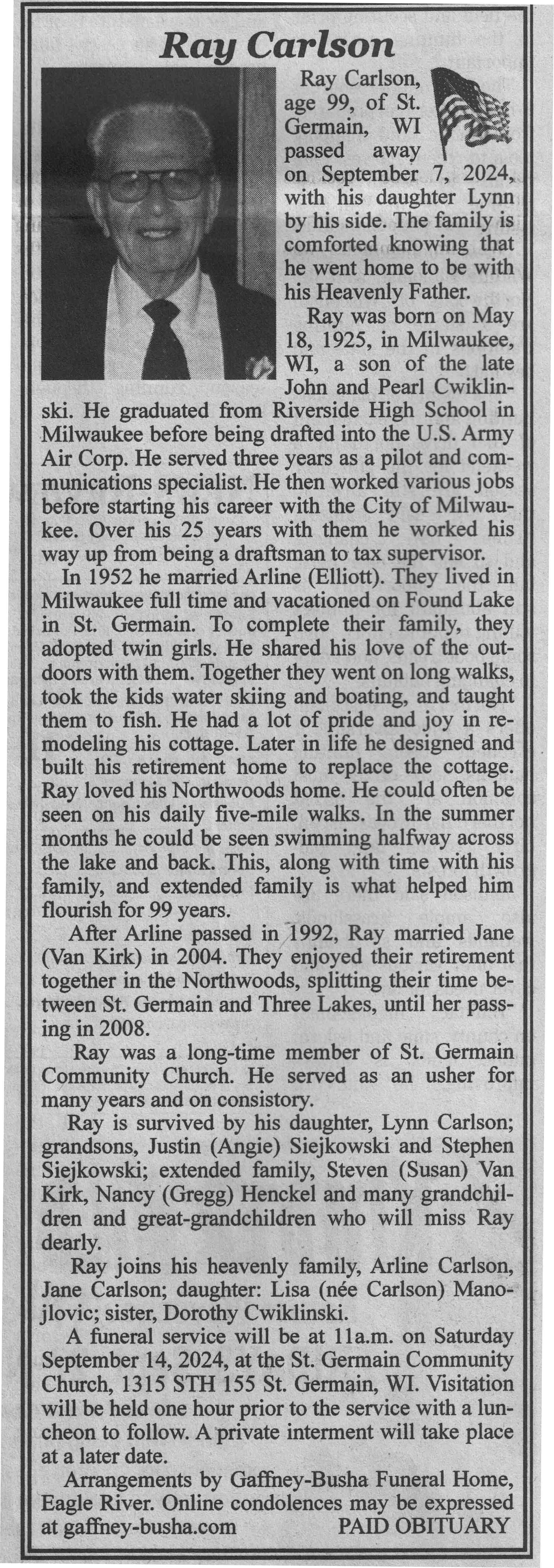 | Carlson | Ray | 18 May 1925 | 07 Sep 2024 | VCNR | 11 Sep 2024 | 4A |