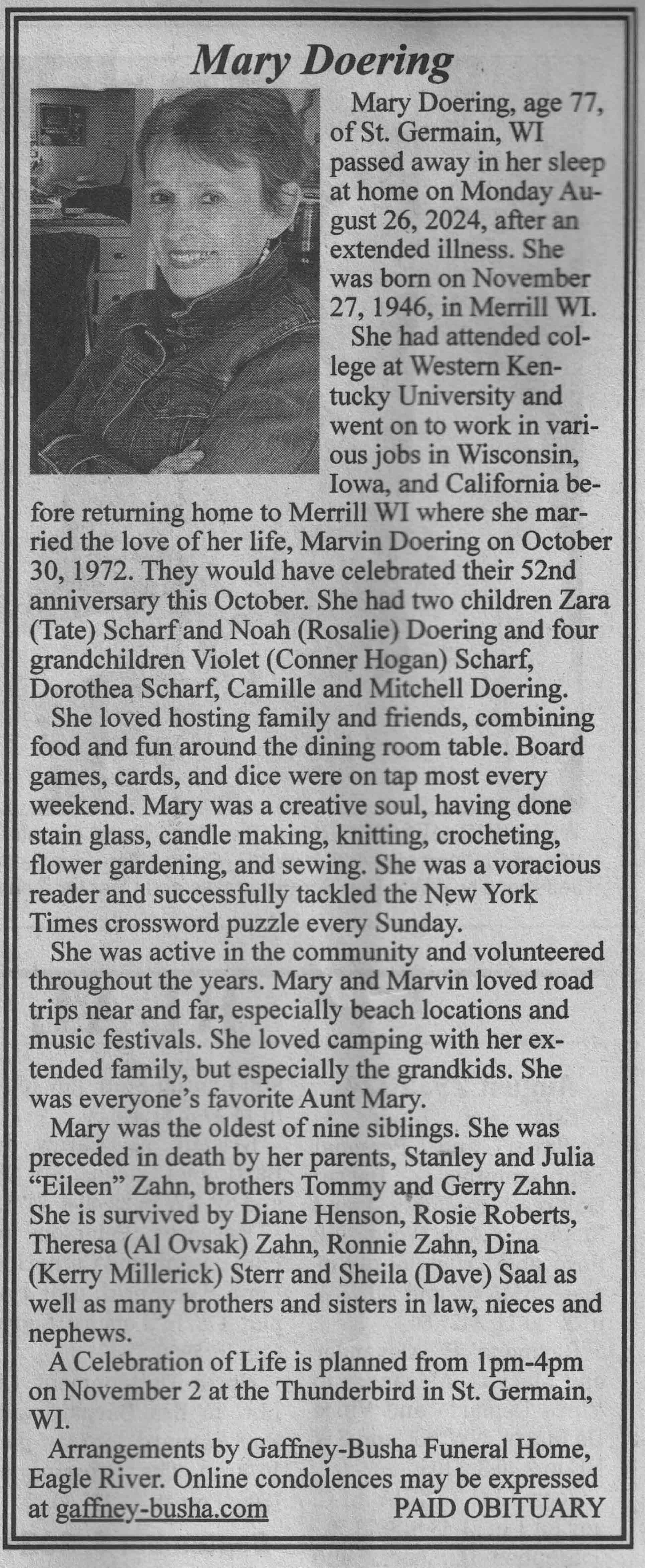 | Doering | Mary (Zahn) | 27 Nov 1946 | 26 Aug 2024 | VCNR | 11 Sep 2024 | 4A |