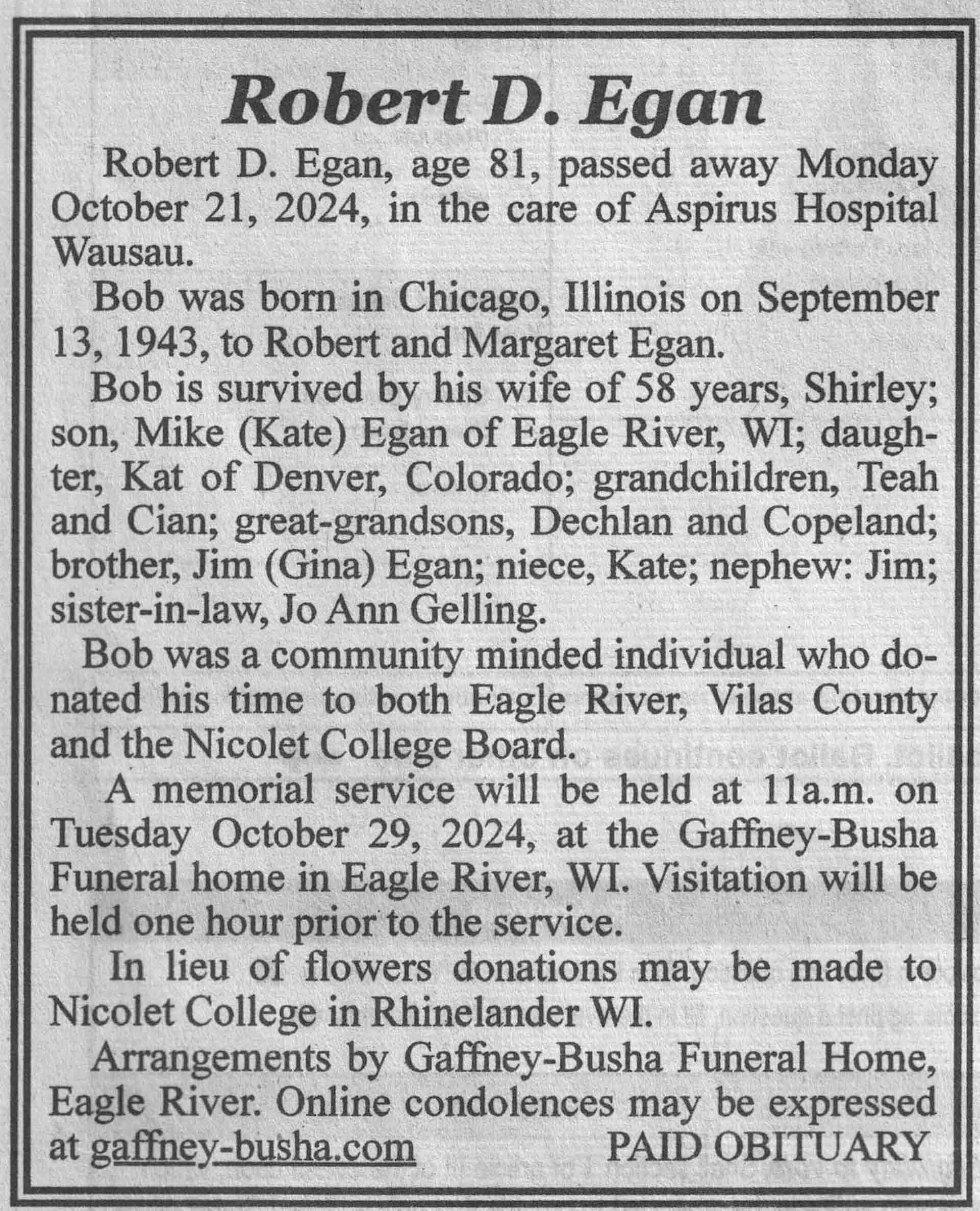 | Egan | Robert D | 13 Sep 1943 | 21 Oct 2024 | VCNR | 30 Oct 2024 | 5A |