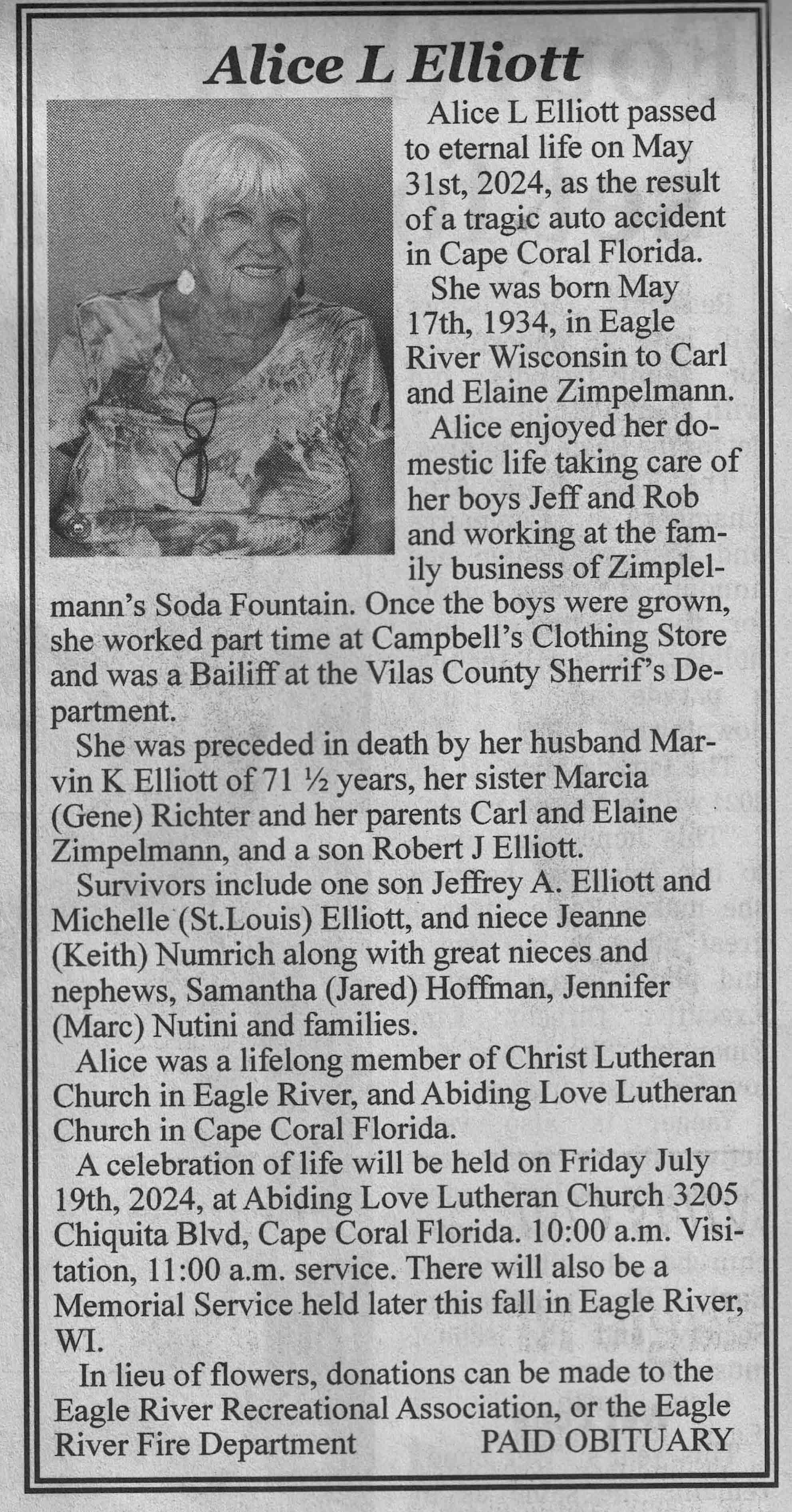 | Elliott | Alice L (Zimpelmann) | 17 May 1934 | 31 May 2024 | VCNR | 26 Jun 2024 | 4A |