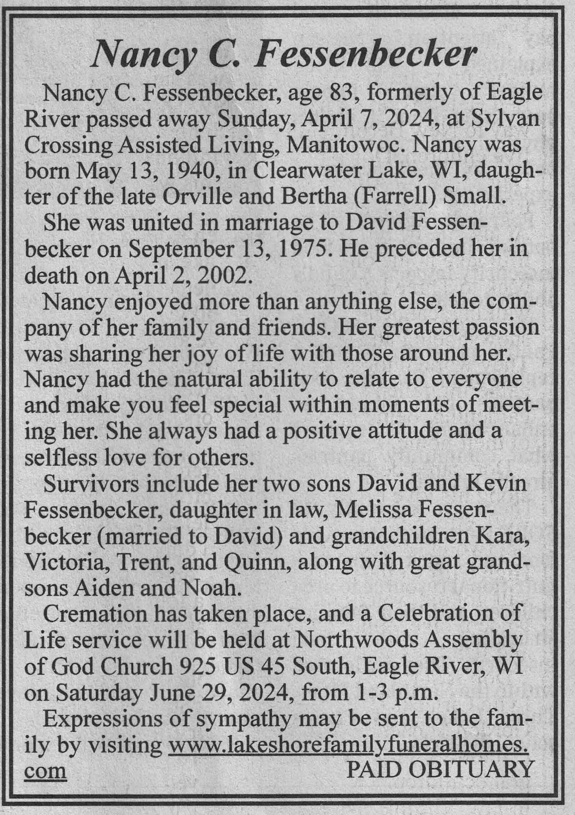 | Fessenbecker | Nancy C | 13 May 1940 | 07 Apr 2024 | VCNR | 26 Jun 2024 | 4A |