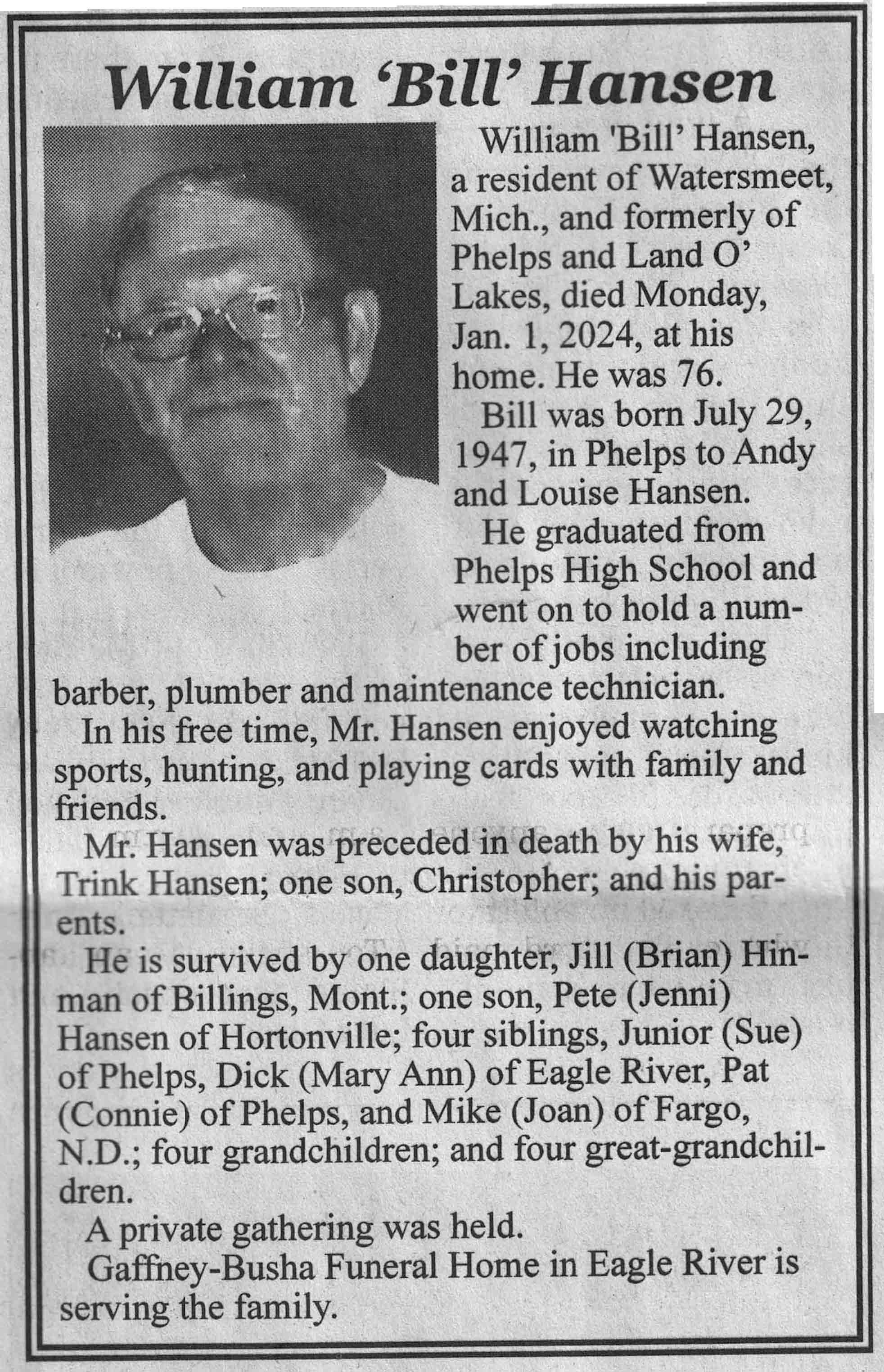 | Hansen | William 'Bill' | 29 Jul 1947 | 01 Jan 2024 | VCNR | 24 Jan 2024 | 4A |